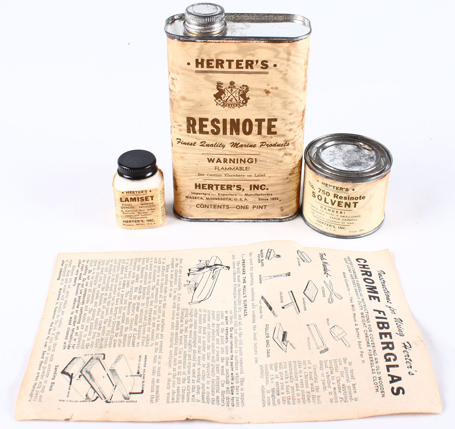 Lot of Herters Resinote, solvent and lamiset, solvent is empty but other 2 are full. Grade: Excellent - Value: 2 to 50