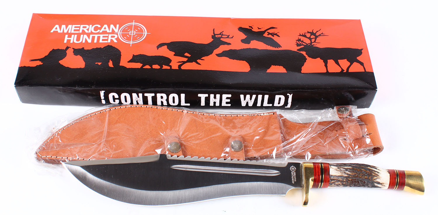 Large American Hunter fixed blade knife, in original box, 11.5'' blade. Grade: Excellent ++ - Value: 2 to 20
