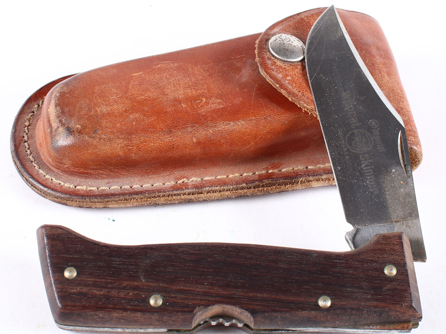 Imperial Wildcat Skinner knife, folding blade, has leather sheath, 4'' blade. Grade: Excellent - Value: 16 to 50