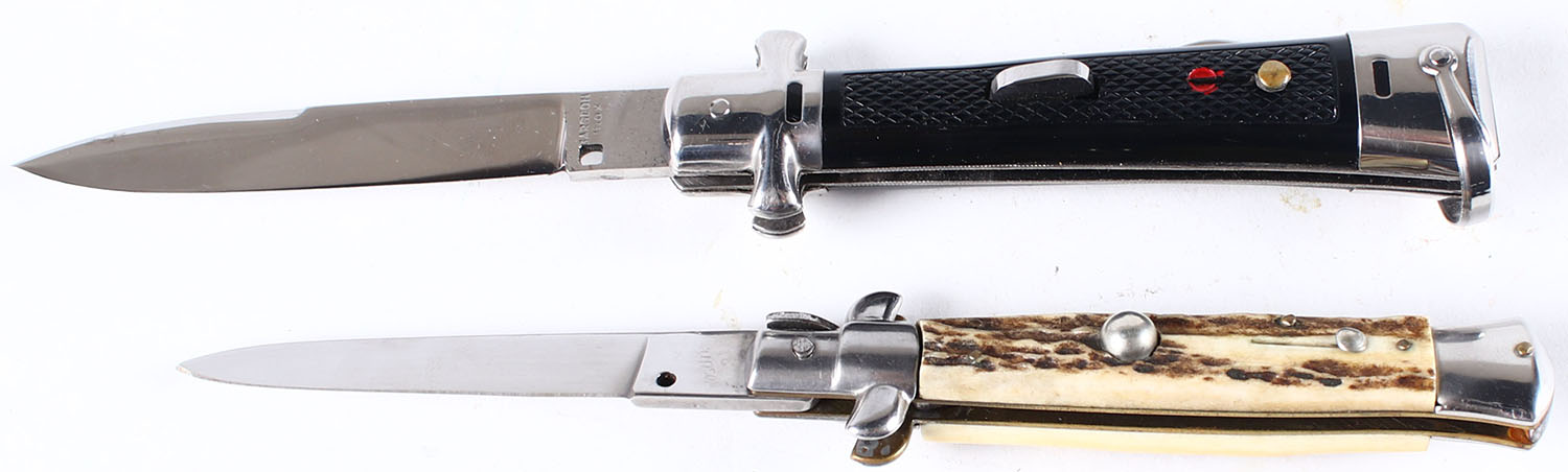 Lot of 2 folding blade knives, all bright and clean, both have spring loaded blades. Grade: Excellent ++ - Value: 30 to 90