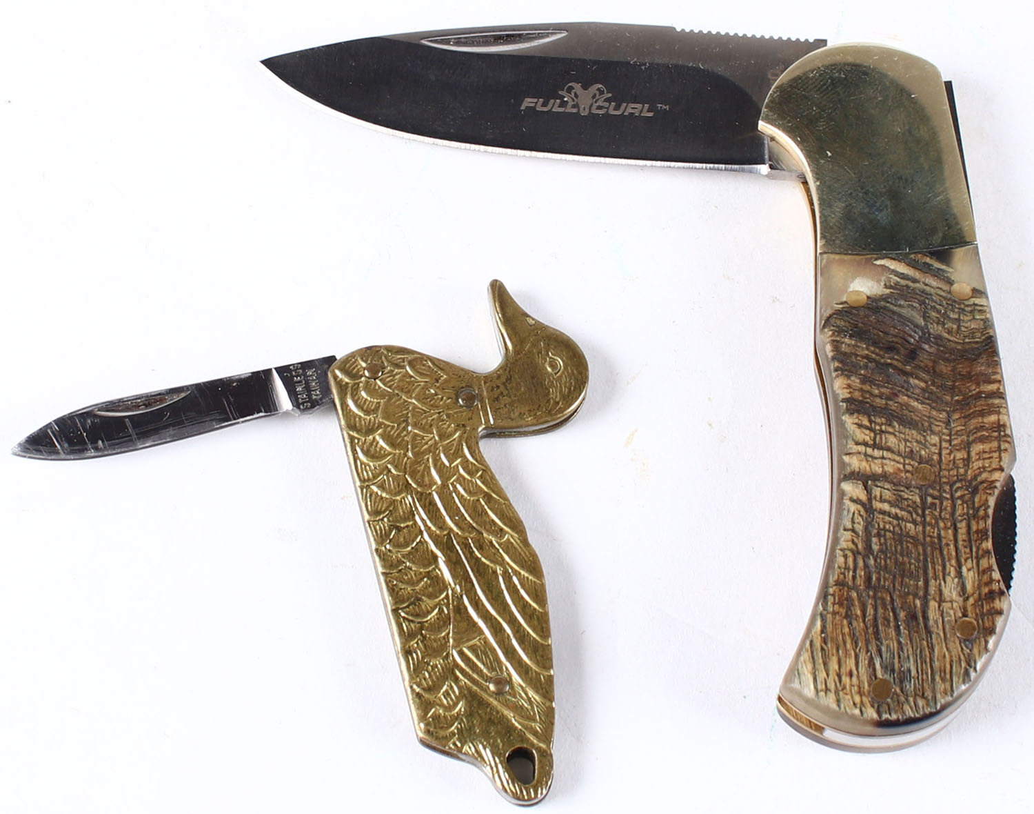 Lot of 2 folding knives, Browning Full Curl and 1 with the handle shaped like a duck. Grade: Excellent - Value: 20 to 60