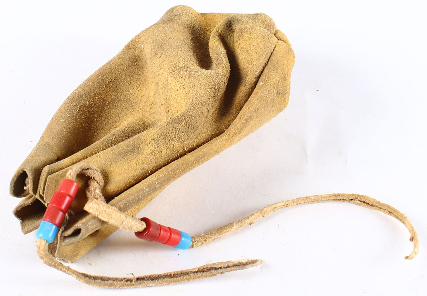 RARE! Cheyenne plains Native American Medicine pouch which contains a bundle of bear hair, Tabacco, bird claws, beaver tooth, snail shell, trade beads and others, Pouch is fully covered in yellow ocher, brain tanned hide with glass trade beads. Grade: Excellent - Value: 50 to 500
