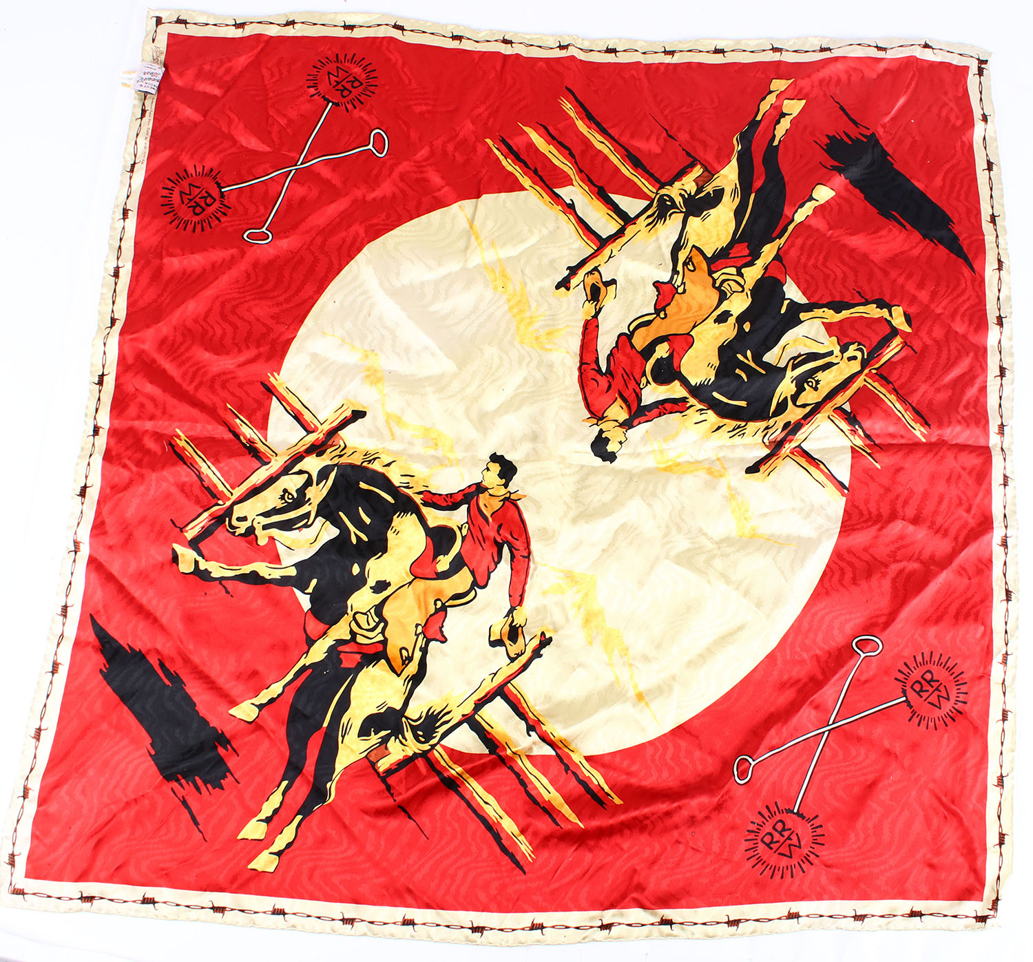 Beautiful silk 35'' square cowboy scarf made by the Rock Mount Ranch Wear co in Denver Colo, late ranch piece about 1948-50. Grade: Very Good - Value: 50 to 150
