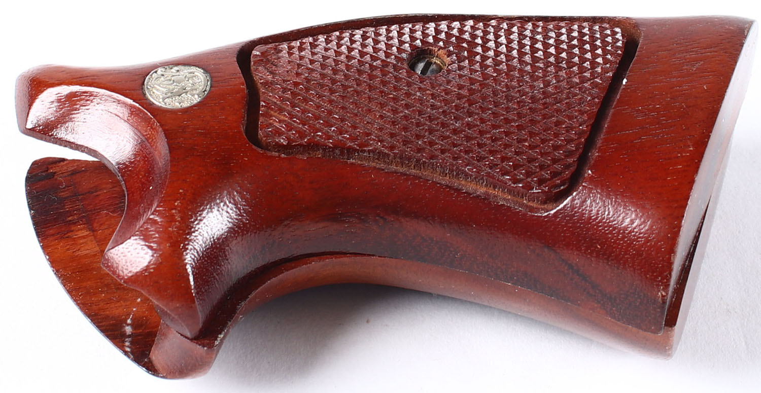 S&W Revolver Checkered wood Grips, has screw. Grade: Excellent - Value: 30 to 90