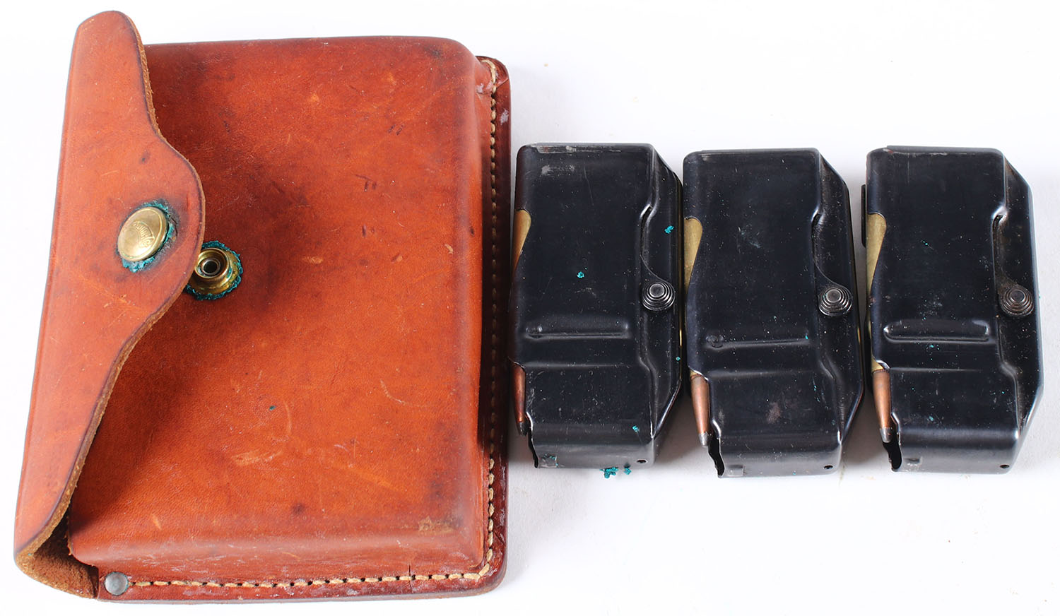 Lot of 3 30-06 rifle mags, in leather Hunter pouch, all mags loaded. Grade: Excellent - Value: 30 to 90