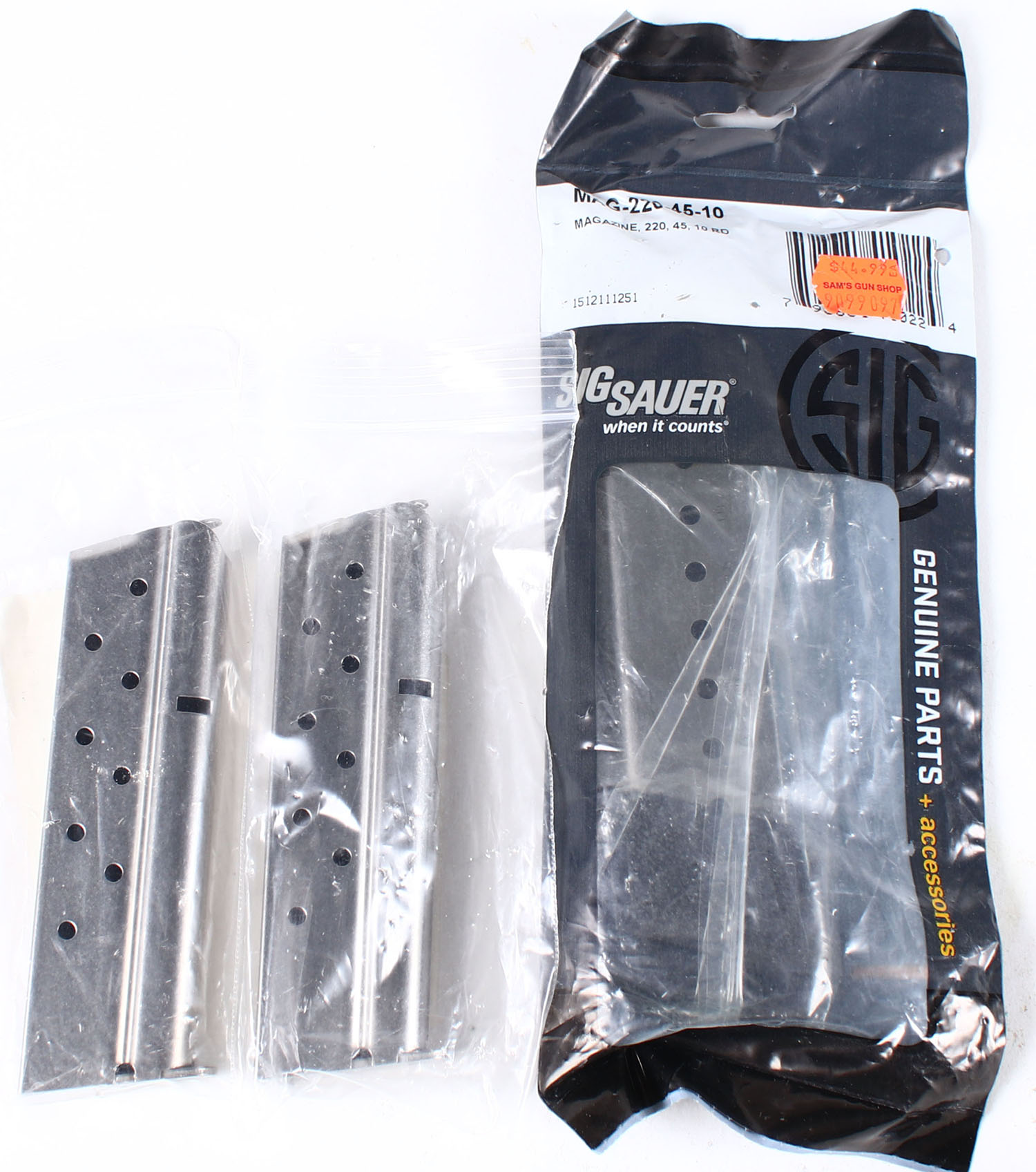 Lot of 3 pistol mags, Sig Sauer 45 cal 10 rd and (2) Colt .38 Super 9 rd mag. Grade: Excellent - Value: 40 to 80