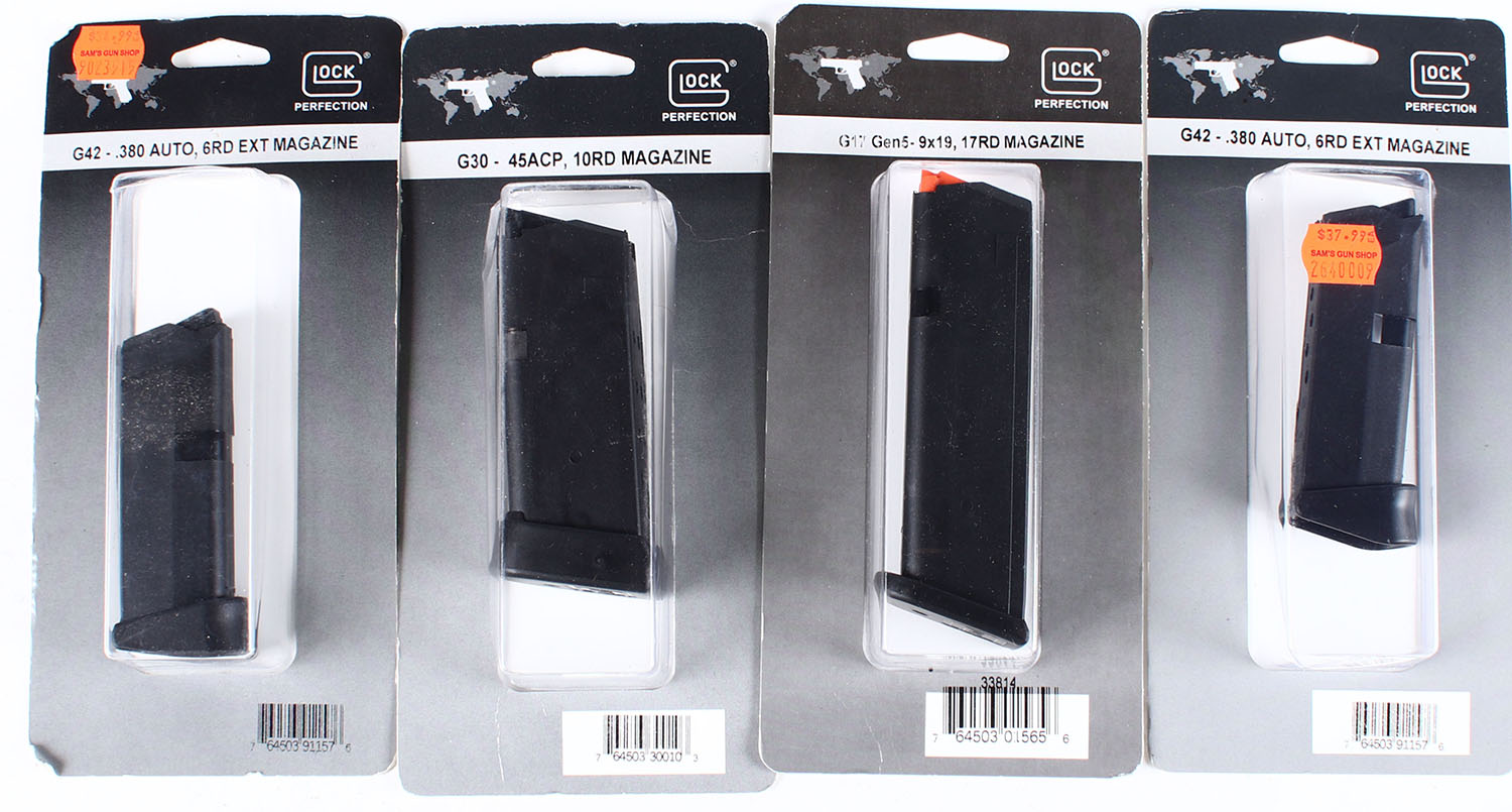 Lot of 4 Glock pistol mags, .380 Auto 6 rd. Grade: Excellent - Value: 40 to 100