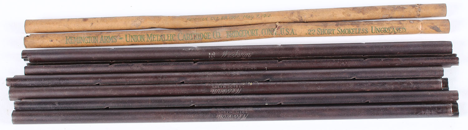 RARE! Lot of gallery tubes, 2 loaded Rem-UMC cardboard tubes Pat 1912 Fully intact, and 6 metal Winchester and Western tubes. Grade: Excellent - Value: 50 to 200