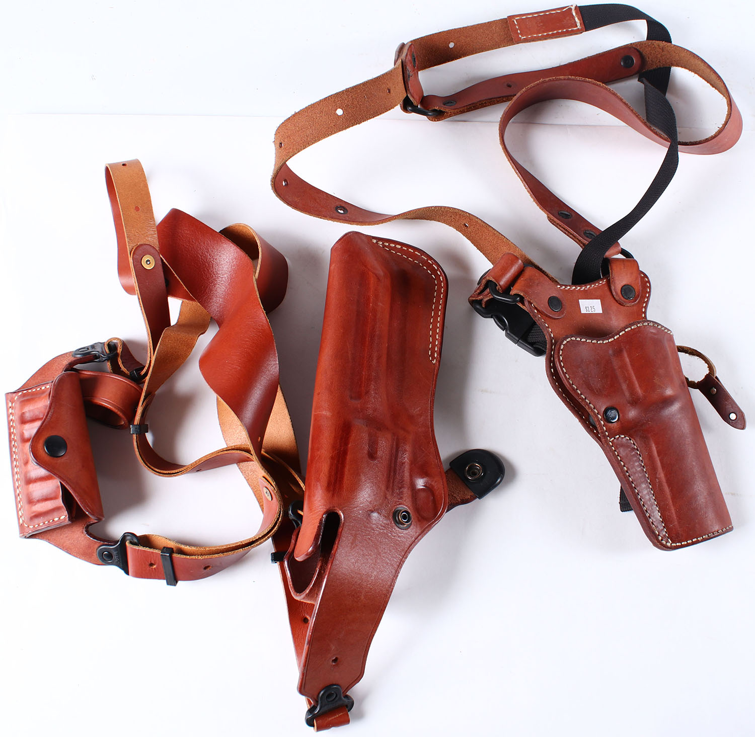 Large lot of leather pistol holsters. Grade: Excellent - Value: 20 to 80