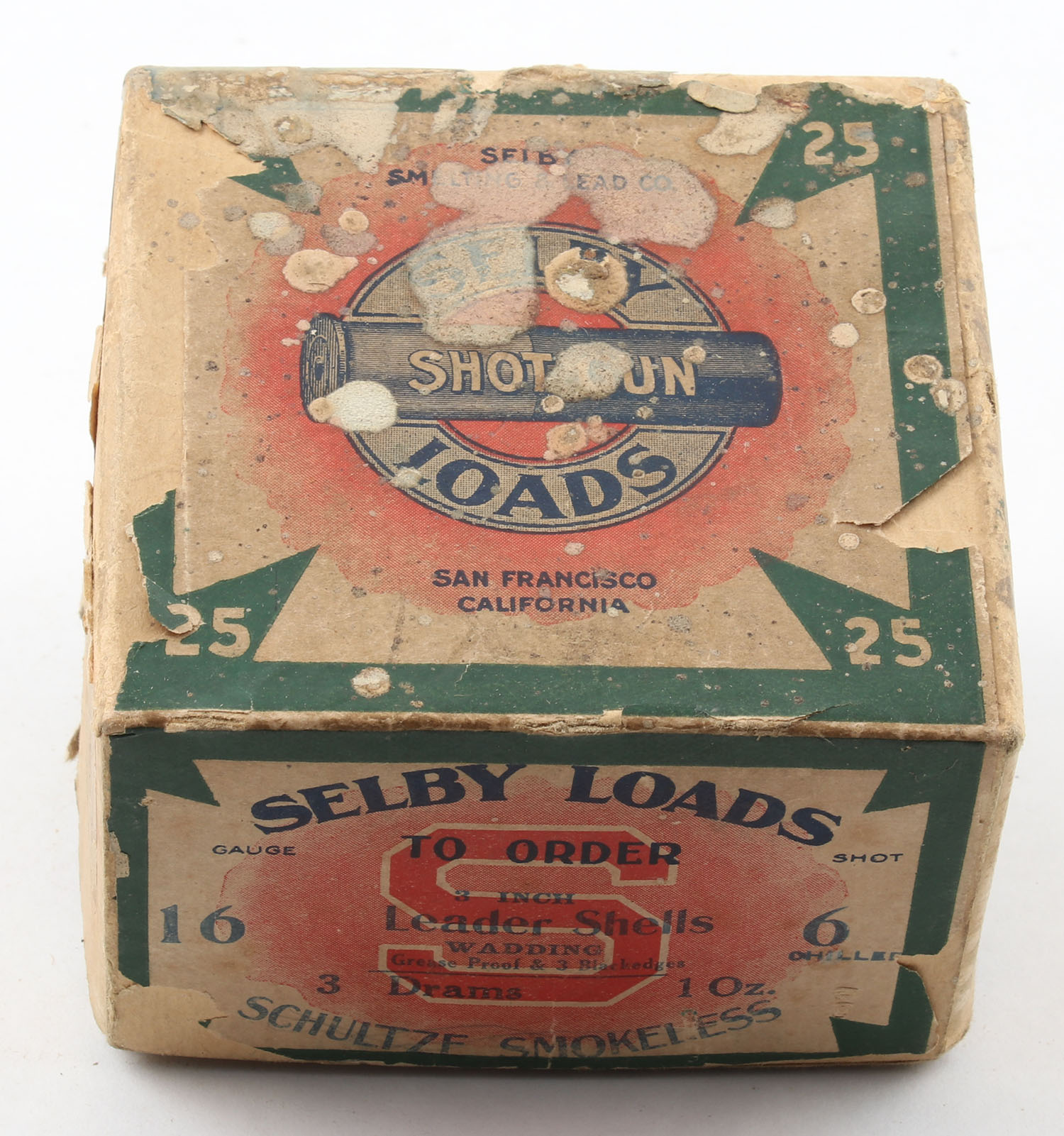 SELBY, Selby Smelting & Lead Co., Selby Shot Gun Loads, Leader Shells, Schultze Smokeless, 16ga, 2pc., Partial 15rds, 5 being correct shot, shot size 6 Chilled Shot, buff box with green, red & blue paper label, box has a seam split with tape repairs, soiling, edge wear & scuffing. Grade: Good + - Value: 70 to 250