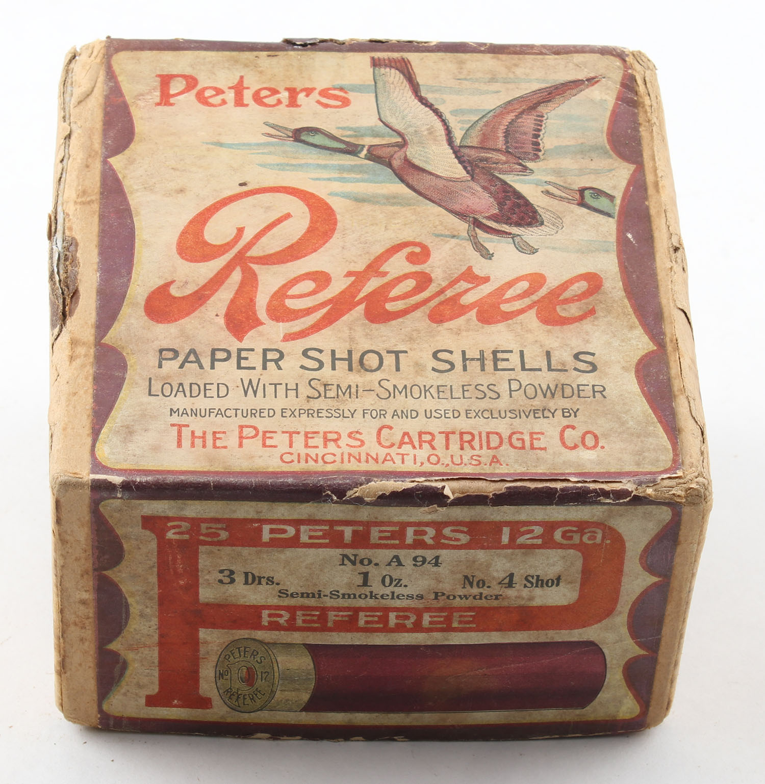 Peters Cart. Co., Referee, 12ga., Full, Loading: No. A94, 3 Drs., 1 Oz., No. 4 shot, buff box with multi-colored label with flying ducks, box has age soiling with edge wear, top has tape repairs to seam splits, bottom has shell protrusion, paper shells are very good to excellent. Grade: Very Good - Value: 400 to 1000
