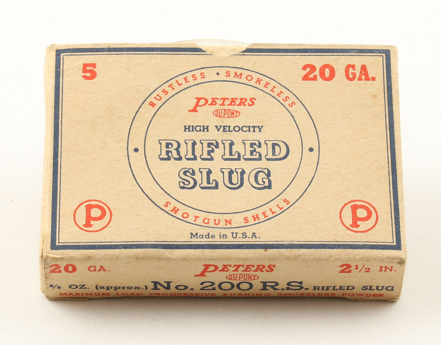 Peters Cart. Div., 20ga., 2 1/2'', 1pc., Full, shot size Rifled Slug, blue, orange & buff colored box, box is solid with very nice colors, paper shells are excellent. Grade: Very Good ++ - Value: 10 to 30