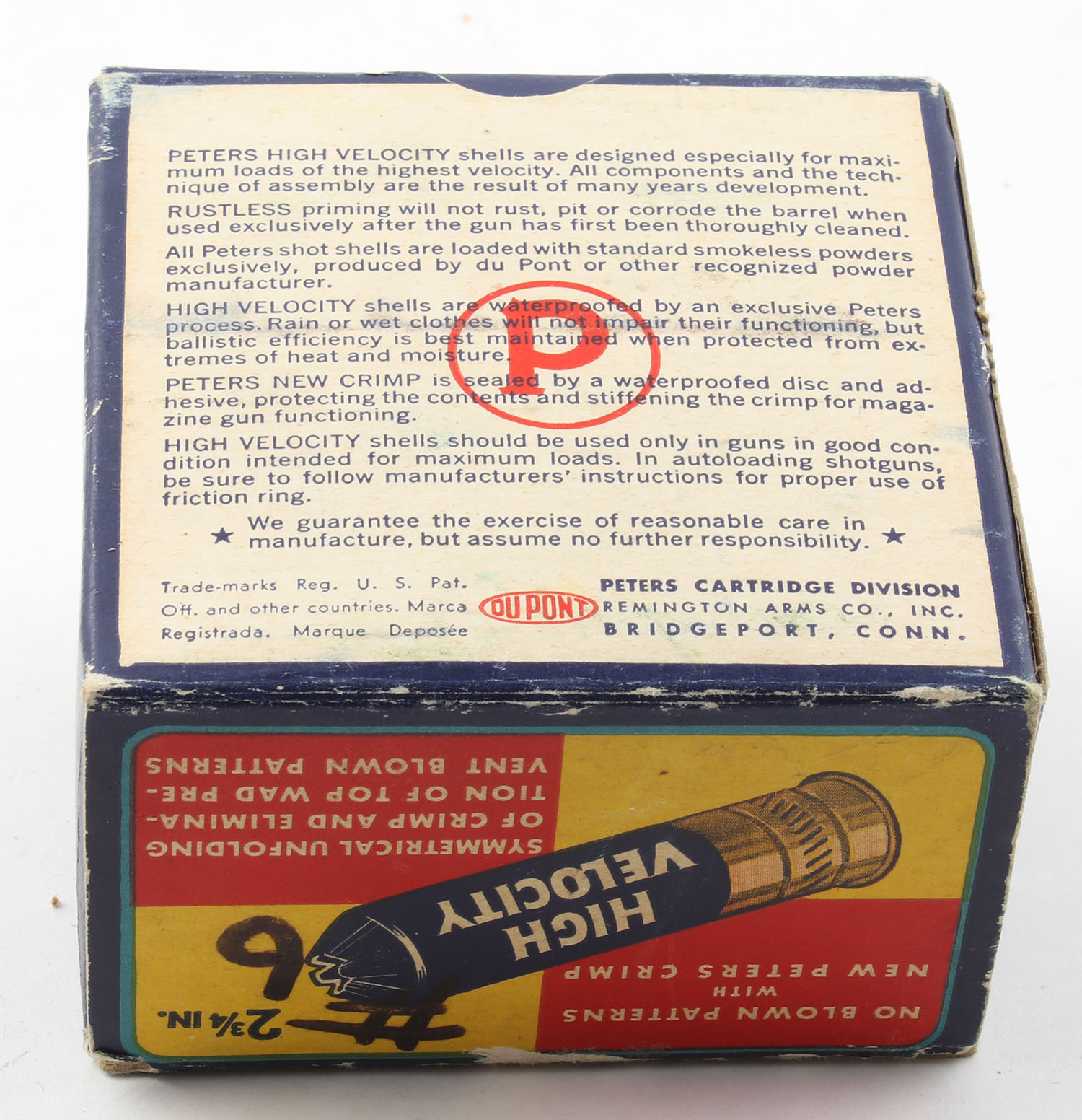 Peters Cart. Co., High Velocity, New Peters Crimp, 12ga., 1pc., Partial 24rds, shot size 6, multi colored box that pictures mallard flying out of the marsh grass, box has light scuffing with edge wear, paper shells are very good. Grade: Very Good - Value: 20 to 60