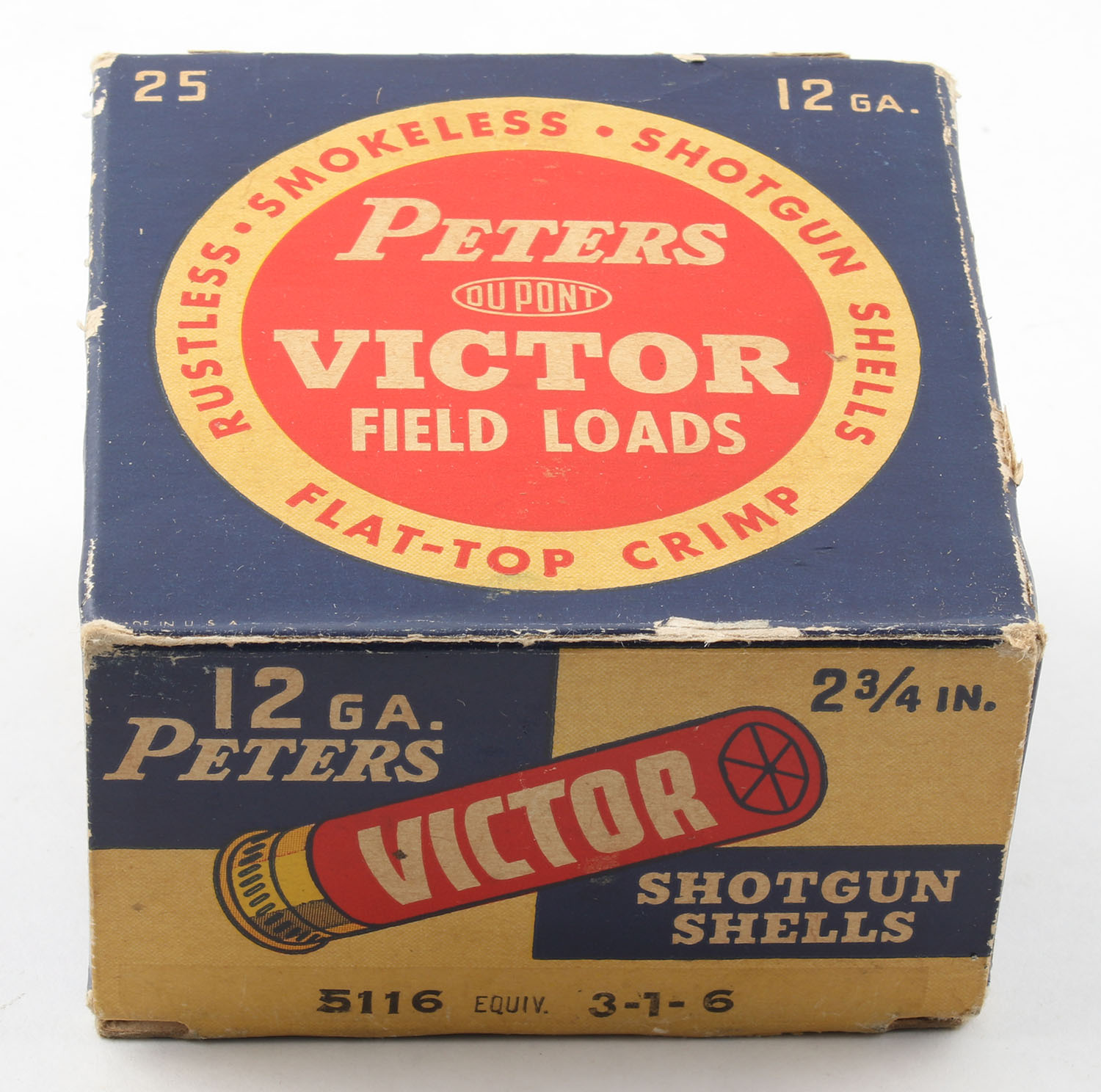 Peters, VICTOR Field Loads, 12ga., 1pc., Full, shot size 6, blue, yellow & red box, box is very solid with excellent colors, has light edge wear, paper shells are excellent. Grade: Excellent - Value: 20 to 60
