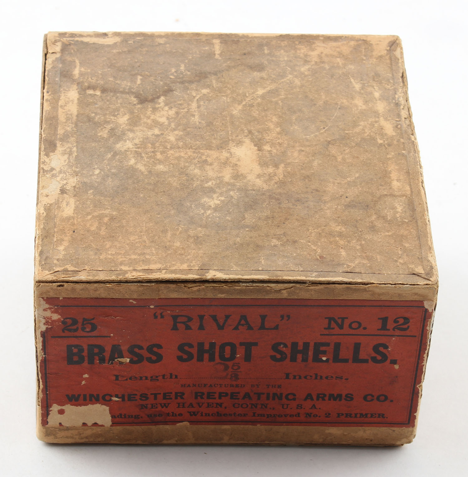 Winchester, RIVAL, BRASS SHOT SHELLS, 12ga., 2 5/8'', Full with 16 shells being correct, buff box with red & black end label, box has age soiling with edge wear, box has seam splits to top & bottom, brass is very good to excellent. Grade: Very Good + - Value: 100 to 300