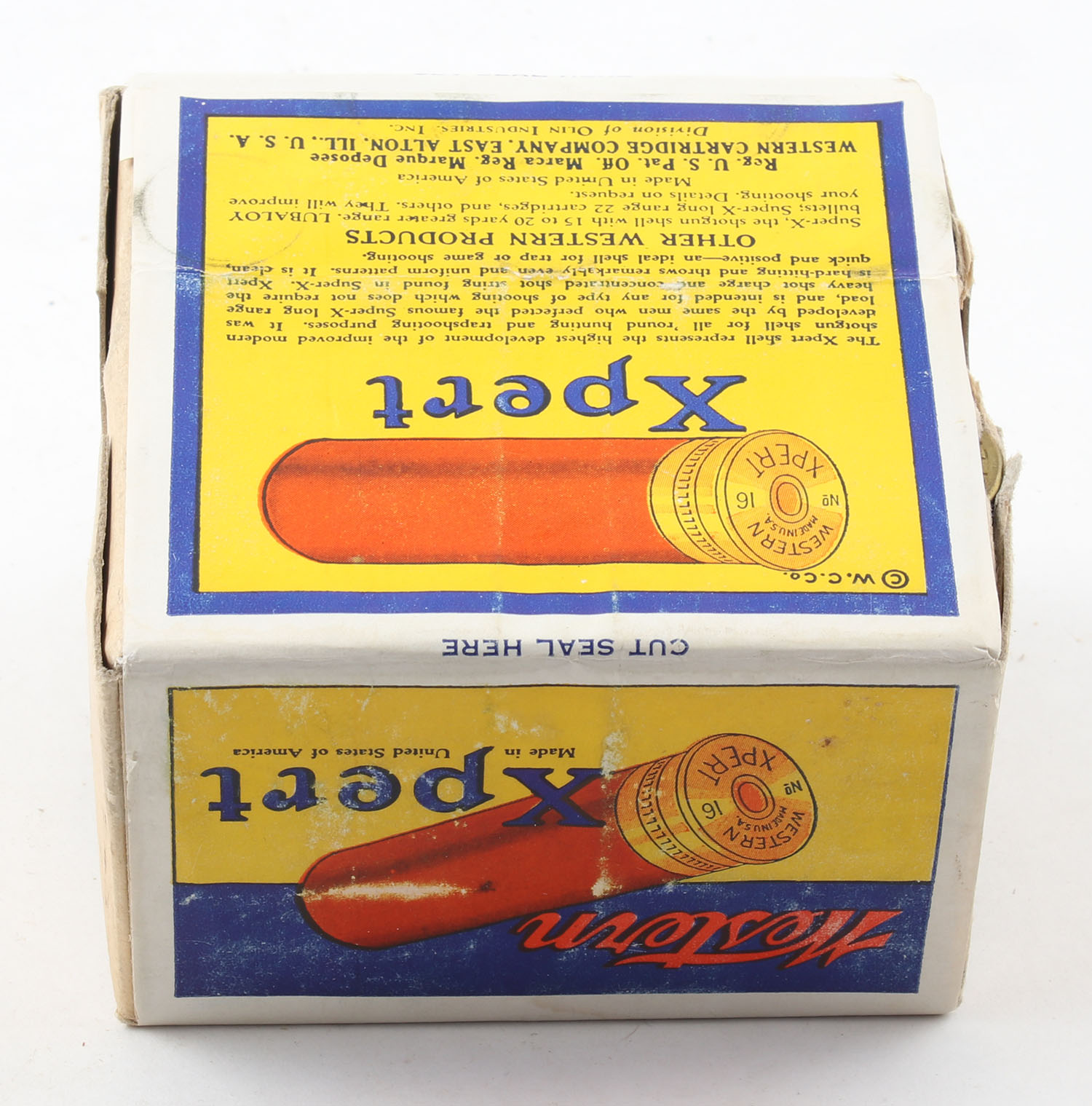 Western, Xpert, 16ga., 2pc., FULL and SEALED, shot size 0, buff box with blue and yellow paper label that pictures the pointer dog on top, box is very solid has light age soiling with great colors. Front of box says ''Shot and Powder Not Loaded In U.S.A'' but says ''Made In United States Of America'' on top of box, loaded in Mexico. Grade: Excellent + - Value: 100 to 250
