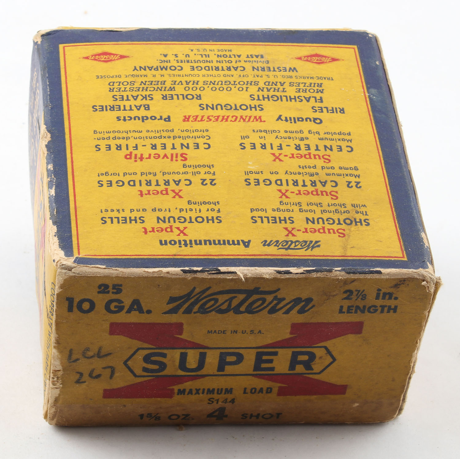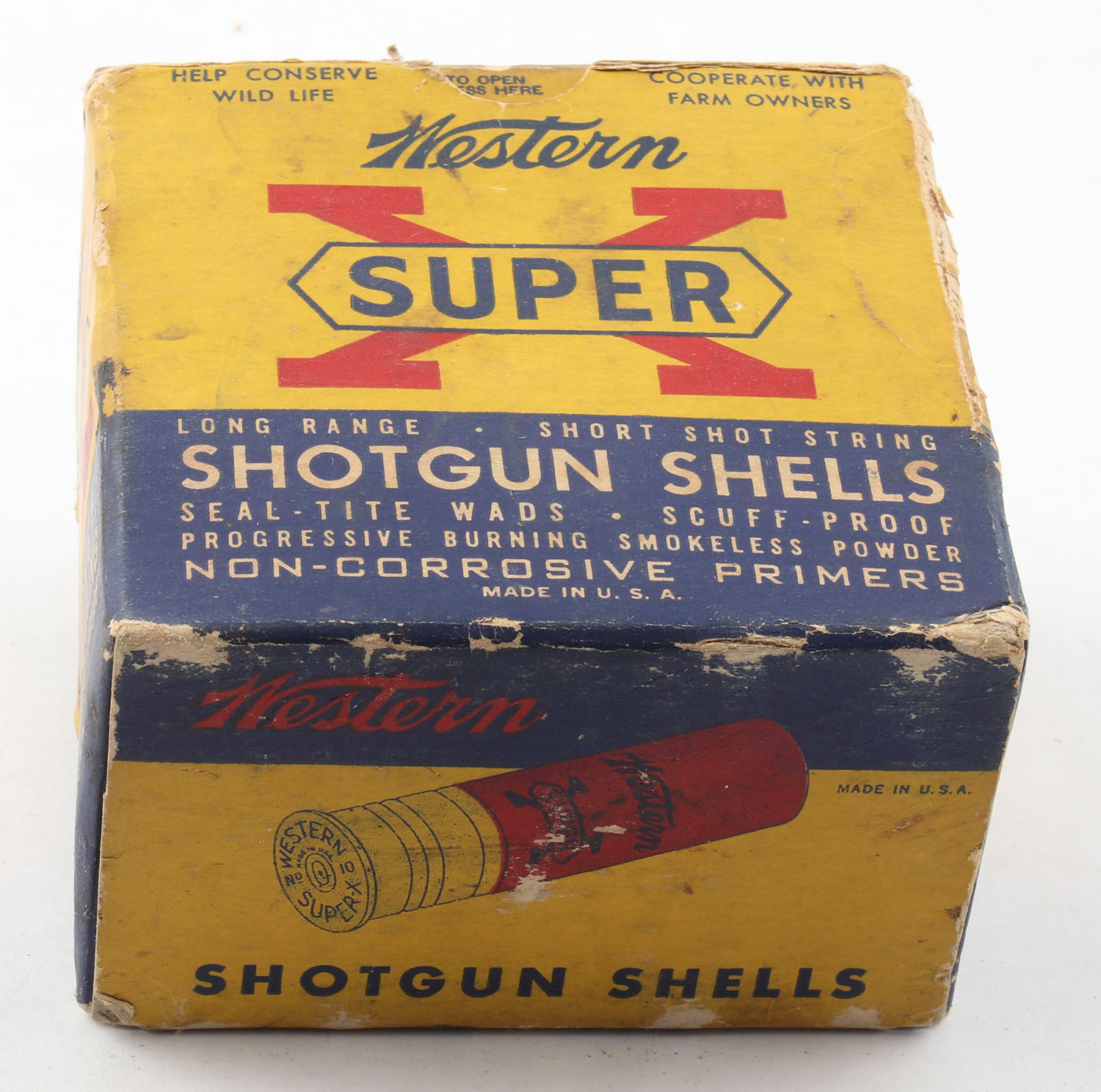 Western, Super X, 10ga., 1pc., Full, shot size 4, 2 7/8'', multi-colored box, box has age soiling & edge wear with a torn inside flap, paper shells are excellent. Grade: Very Good - Value: 20 to 60