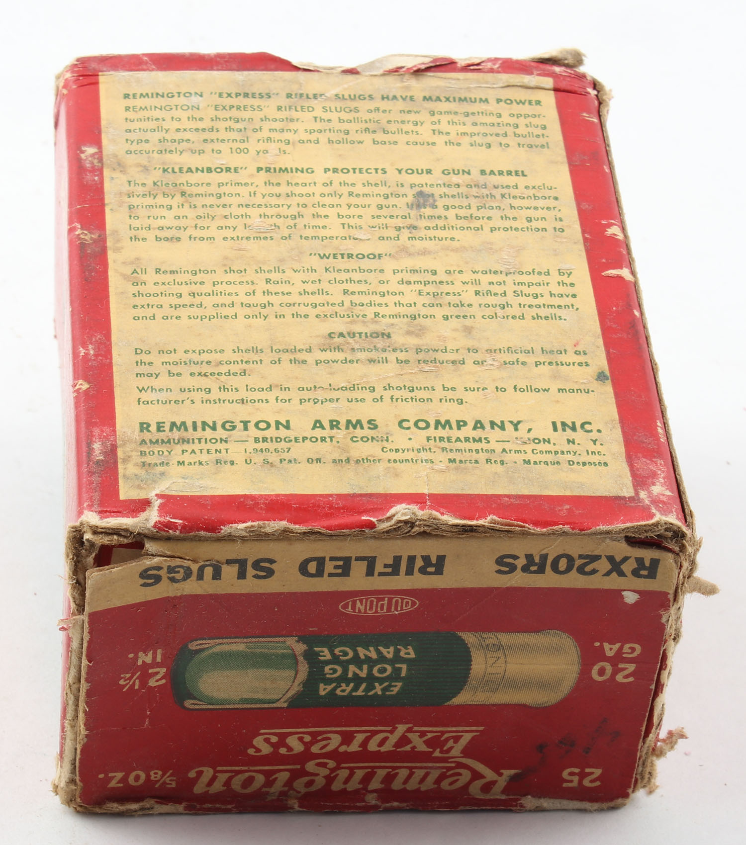 Remington, Express Extra Long Range, 20ga., 1pc., Full, shot size Rifled Slugs, 2 1/2'', case has five boxes inside each has 5rds., inside boxes are excellent. Case has edge & corner wear, shells are excellent. Grade: Very Good ++ - Value: 10 to 30