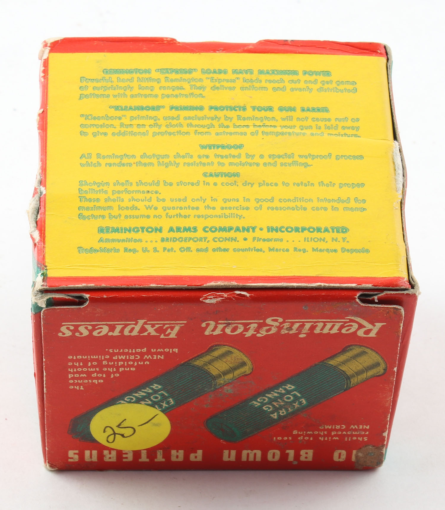 Remington Express, Extra Long Range, 28ga., 2 3/4'', 1pc., Full, shot size 7 1/2, box is white, yellow, red and green, box is very solid with edge wear & excellent color, paper shells are excellent. Grade: Excellent - Value: 10 to 40