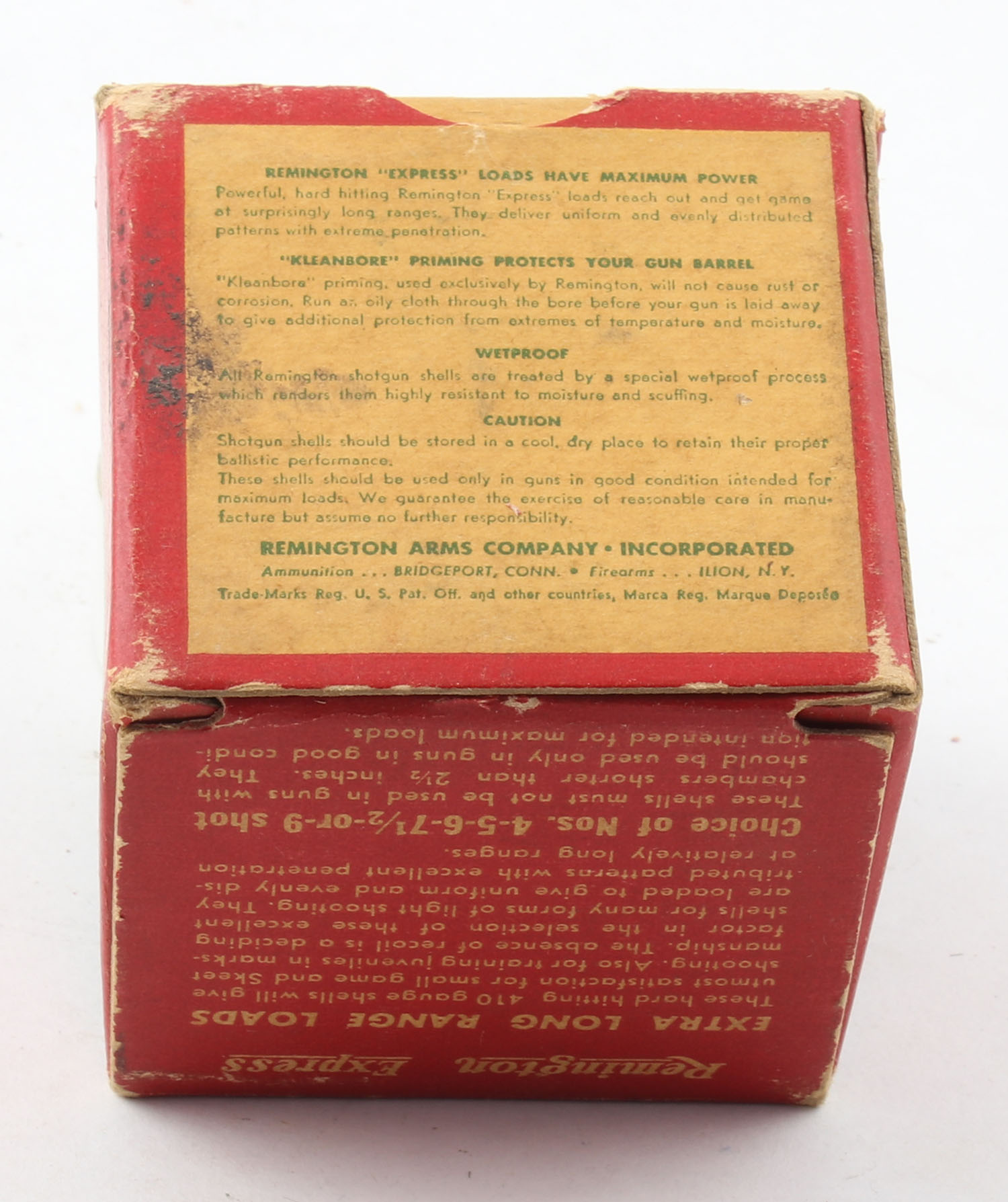 Remington Express, Extra Long Range, 410ga., 2 1/2'', 1pc., Full, shot size 6, box is white, yellow, red and green, box is solid with minor edge wear, paper shells are excellent. Grade: Excellent - Value: 10 to 50
