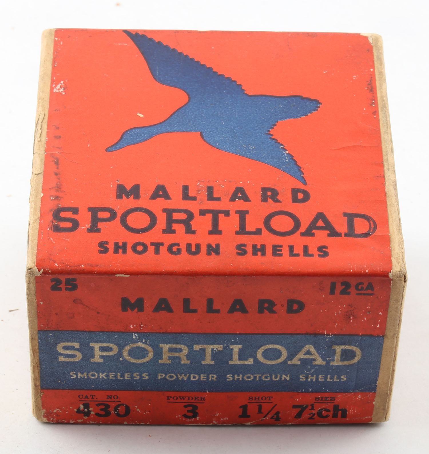 Sears, Sportload MALLARD, 12ga., 2pc., Empty, shot size 7 1/2CH., red & blue box that pictures a Mallard in flight, box has light edge & corner wear, label is intact with great colors. Grade: Very Good ++ - Value: 40 to 100