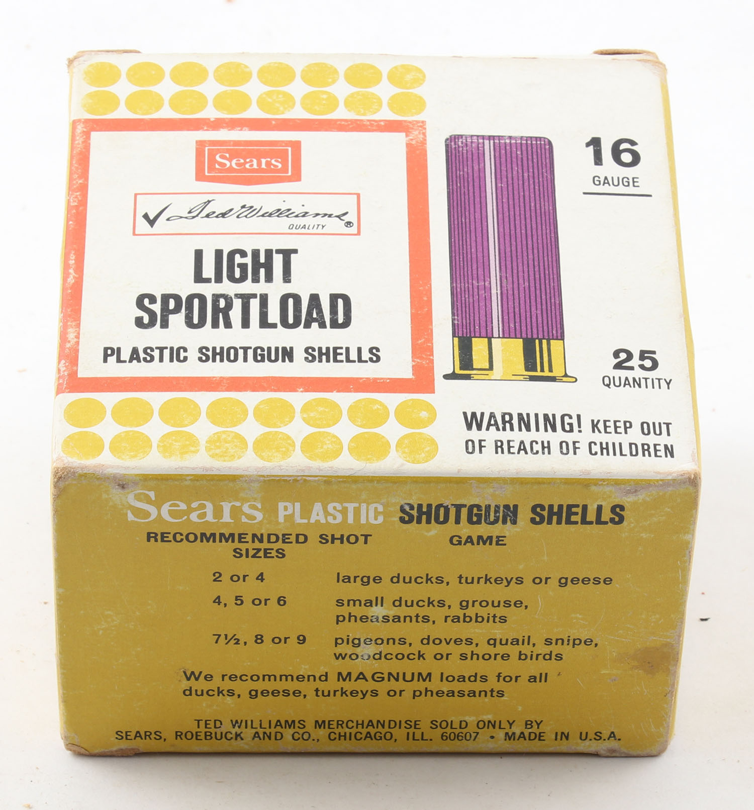 Sears, Light Sportload, 16ga., 1pc., Full, shot size 8, multi-colored box, box is very solid with excellent colors, plastic shells are excellent. Grade: Excellent - Value: 10 to 30