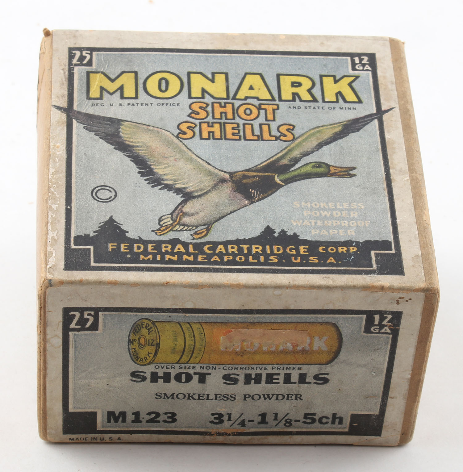 Federal Cart. Co., MONARK, 12ga., 2 PIECE!, Empty, shot size 6, buff box with black border & multi-colored label that pictures Mallard in flight, box has a seam split to top & bottom, box has good color. Grade: Very Good ++ - Value: 40 to 80