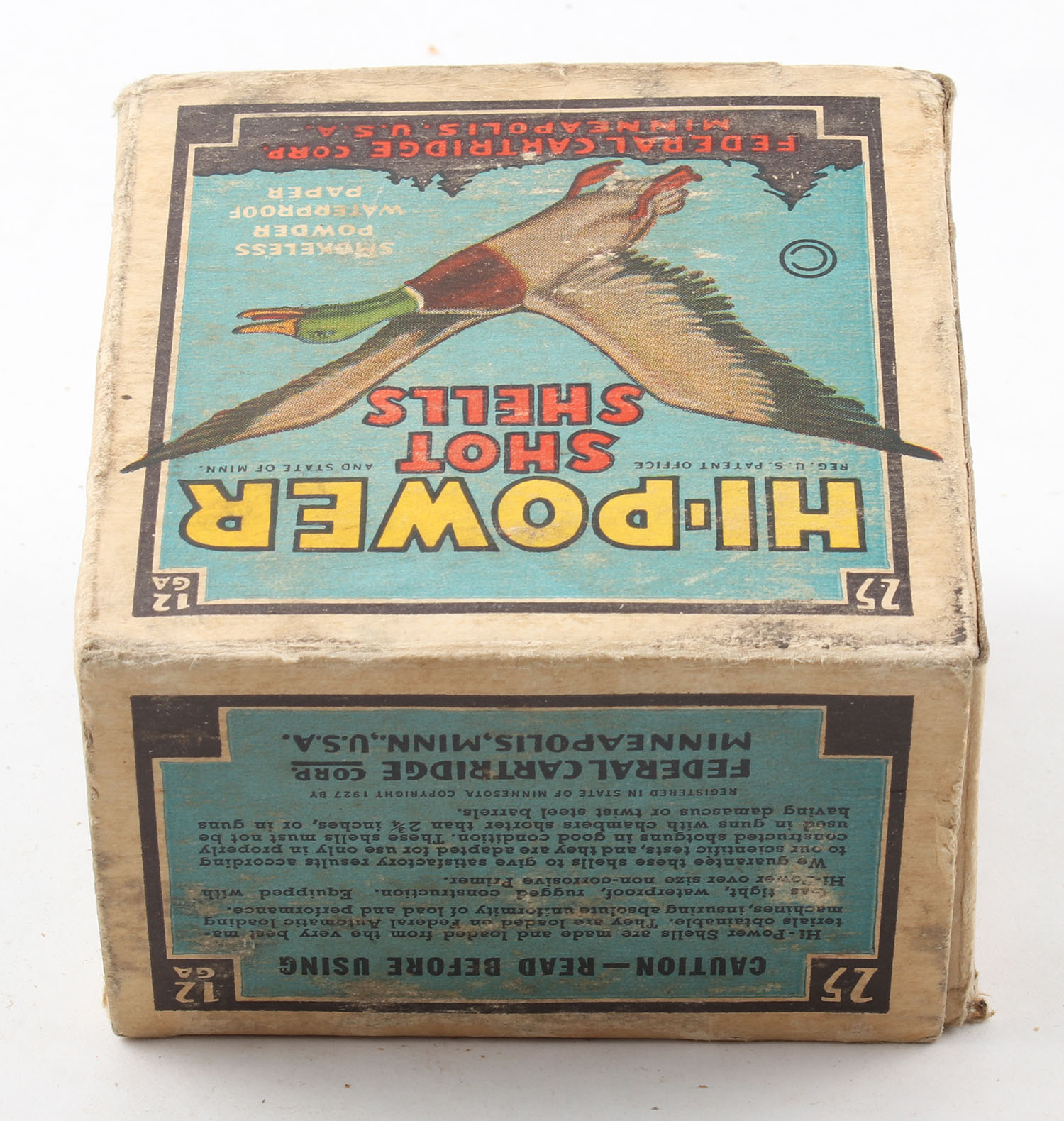 Federal Cart. Co., HI-POWER, 12ga., 1pc., Full with 13rds. Being correct, shot size 2, Black border, blue, yellow and red box with flying mallard, box has age soiling with edge & corner wear, paper shells are very good. Grade: Good ++ - Value: 10 to 40