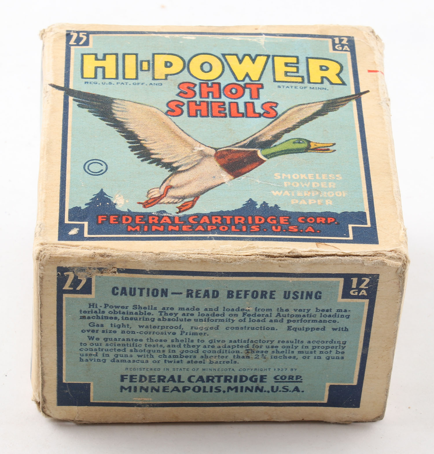 Federal Cart. Co., HI-POWER, 12ga., 1pc., Partial 15rds., shot size 6 Magnum, Blue border, blue, yellow and red box with flying mallard, box has age soiling with edge & corner wear, paper shells are very good. Grade: Good ++ - Value: 10 to 40