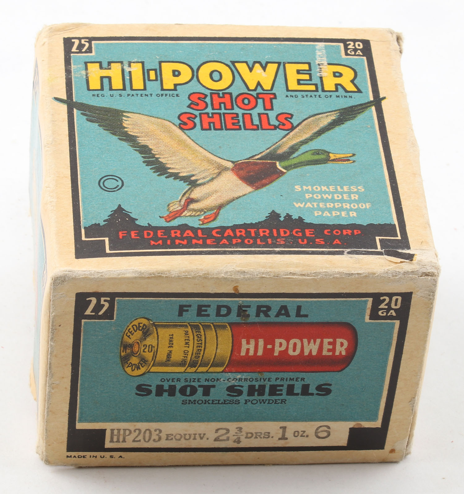 Federal Cart. Co., HI-POWER, 20ga., 1pc., Full, shot size 6, Black border, blue, yellow and red box with flying mallard, box has edge wear with very nice colors, paper shells are excellent. Grade: Very Good ++ - Value: 10 to 40