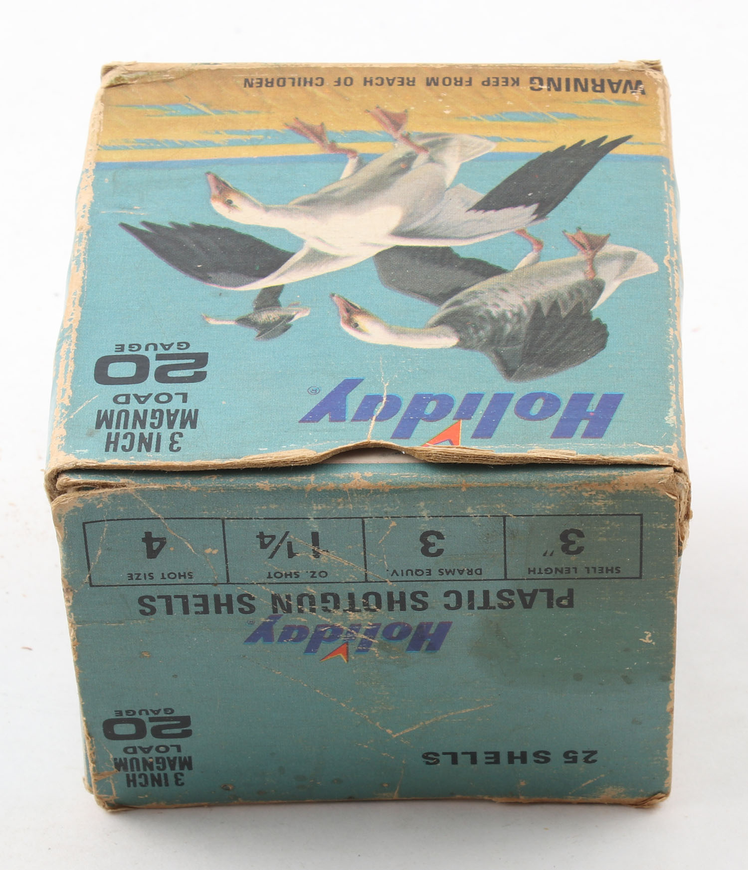 Holiday, Snow Goose, 20ga, 1pc., Empty, 3'' Magnum, shot size 4, multi color graphics by Les Kouba, box has age soiling & edge wear with great color. Grade: Very Good - Value: 10 to 60