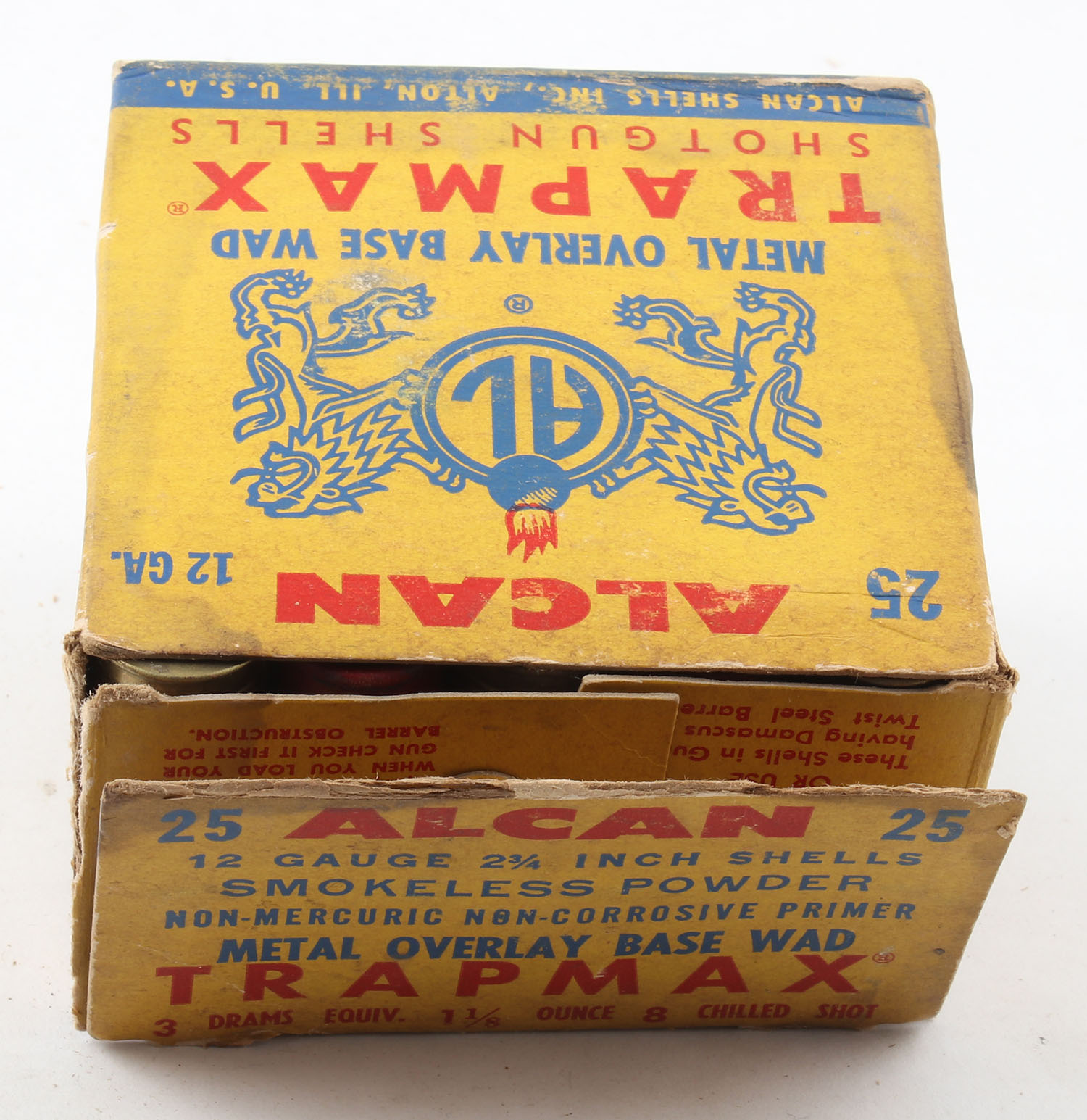 Alcan, Trapmax, 12ga., 1pc., Full, shot size 8Ch., multi-colored box, box has a seam split to top flap, paper shells are very good. Grade: Good ++ - Value: 10 to 30
