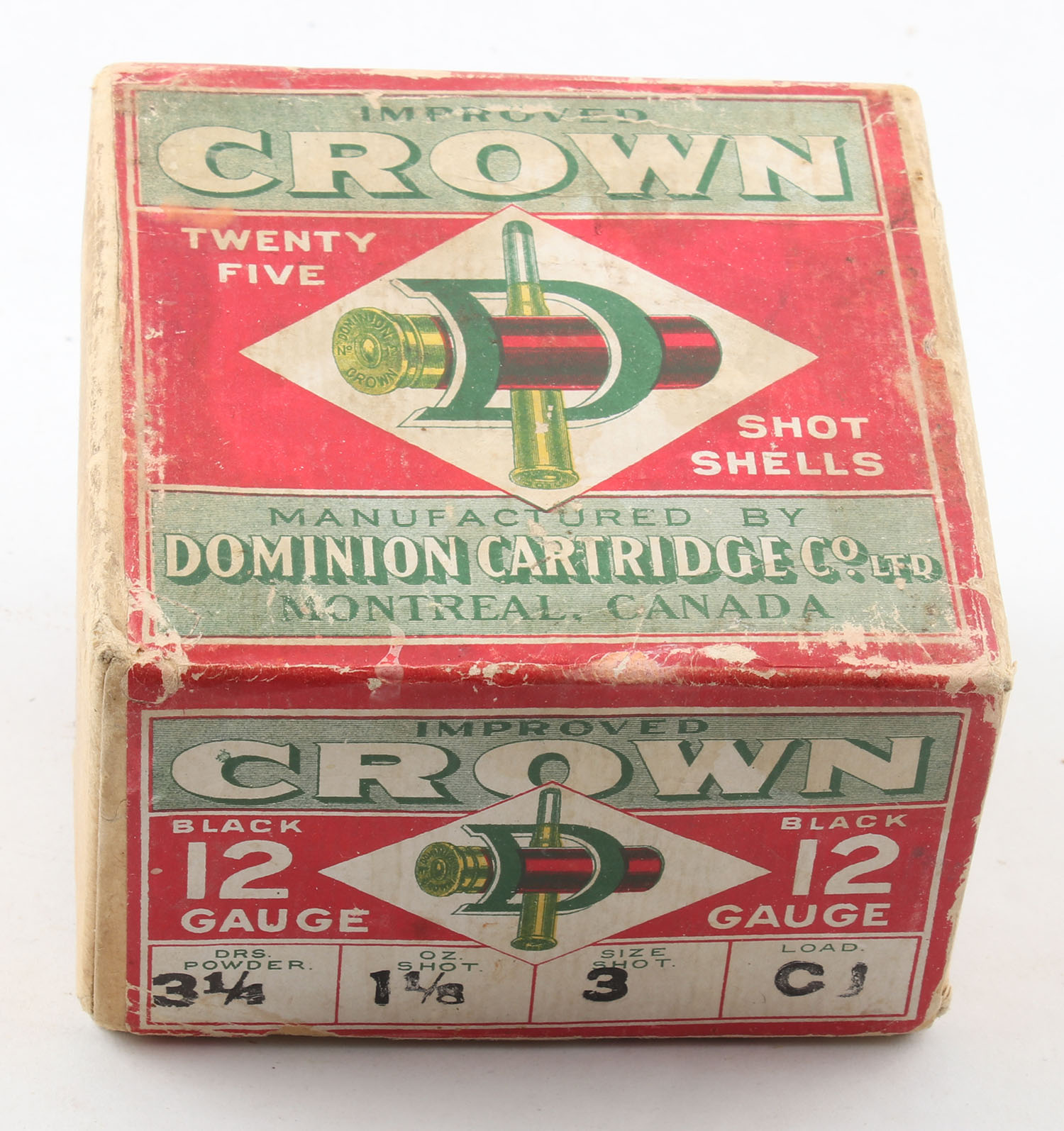 RARE Dominion Cartridge Co, CROWN, 12ga., 2pc., Empty, shot size 3, has early Bent D Logo, box has edge & corner wear, has scuffing with a partial seam split, label is intact with excellent colors. Grade: Very Good ++ - Value: 50 to 200
