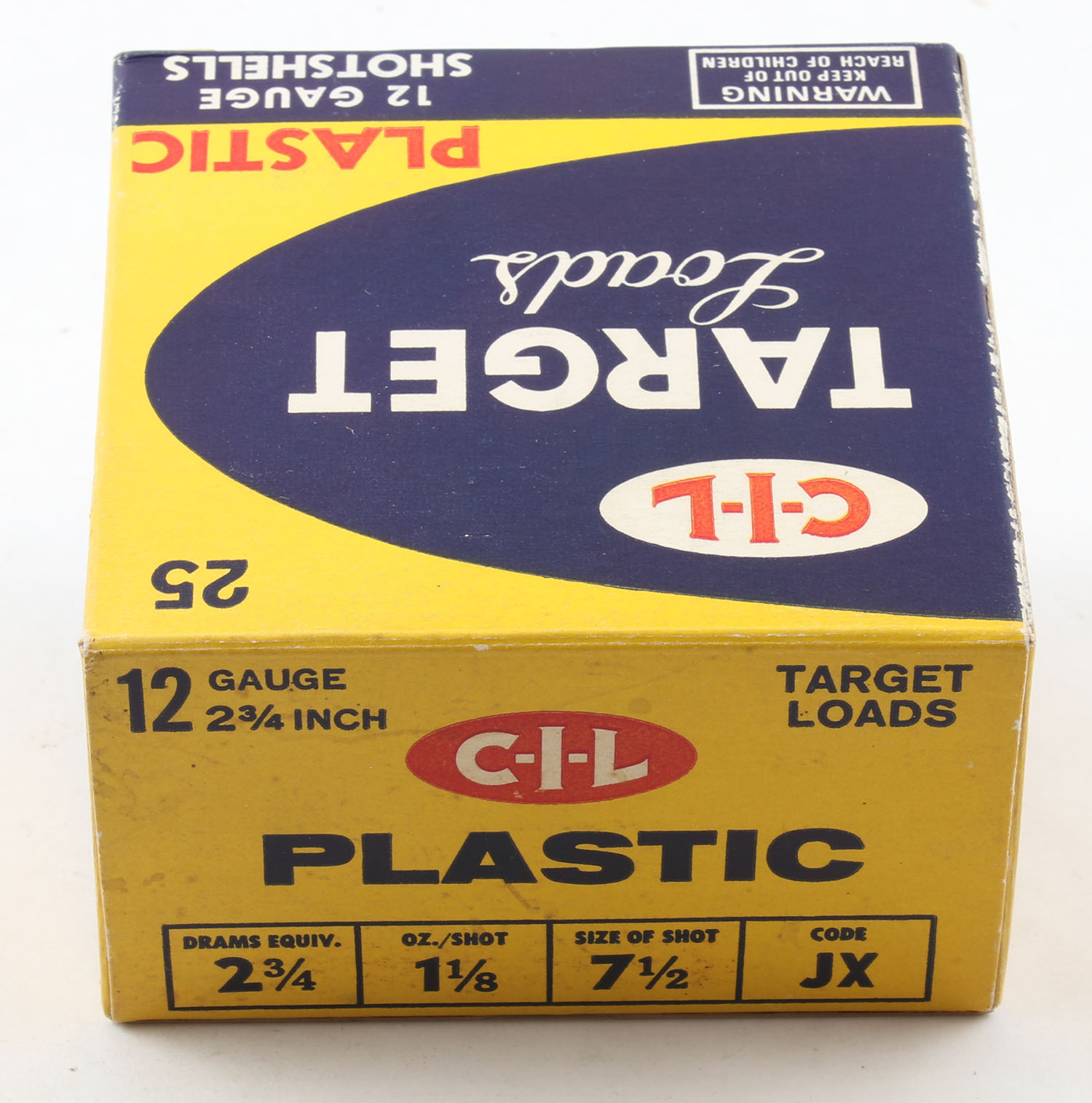 CIL, Target Loads, 12ga., 1pc., Full, shot size 7 1/2, multi-colored box, box is very solid with excellent color, corners are sharp, edges are crisp, plastic shells are excellent. Grade: Excellent ++ - Value: 10 to 50