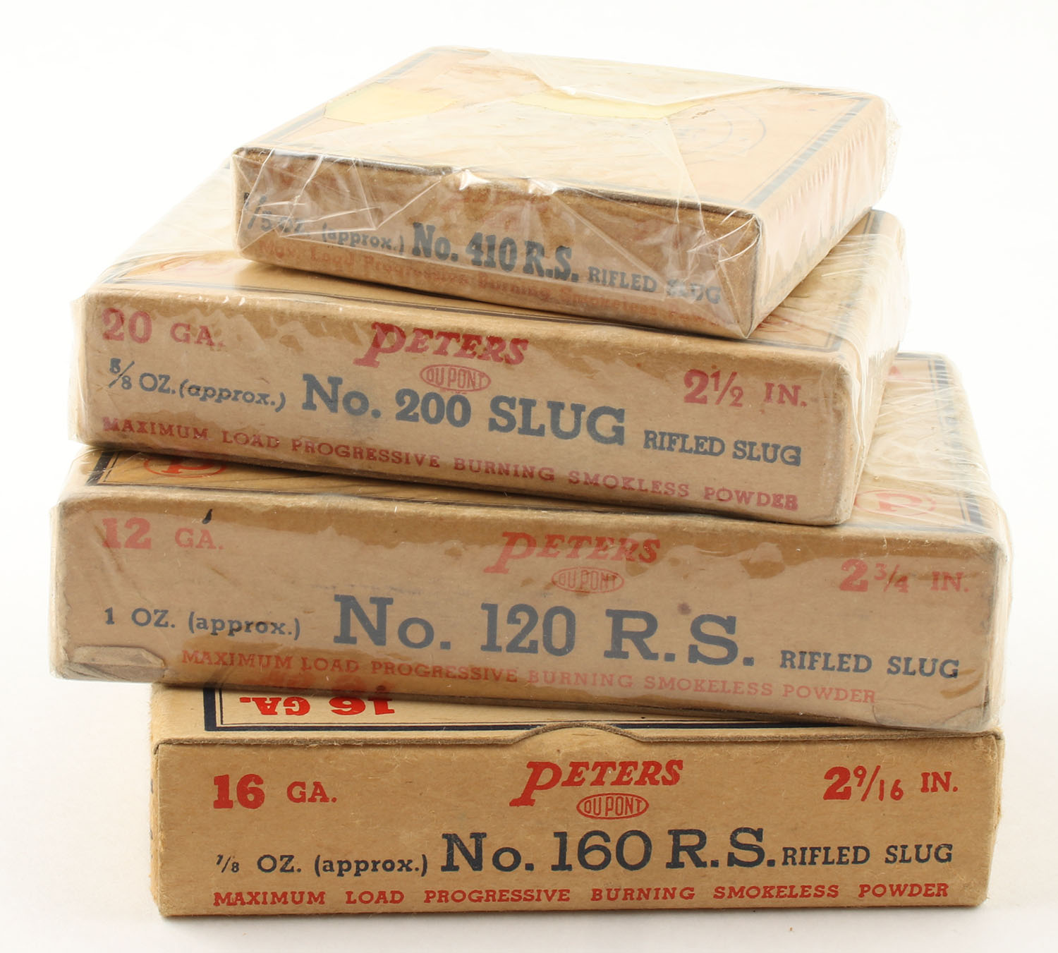 Lot of 4 Peters, 12/16/20/410ga., 1pc., Appears Full, shot size Rifled Slug, multi-colored boxes. Grade: Very Good ++ - Value: 10 to 50