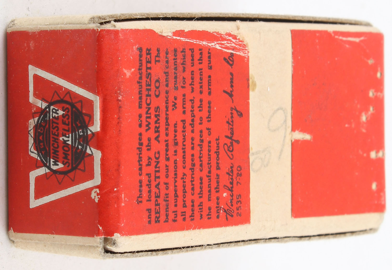 Winchester, Smokeless Rifle Cartridges, .22 Short, RR: WRA-177 S-62a, FULL & SEALED, 2pc. Buff box with red wraparound label, box is solid with minty color, front & bottom have been written on, corners are mostly sharp, edges are crisp, label is intact. Grade: Excellent - Value: 150 to 225