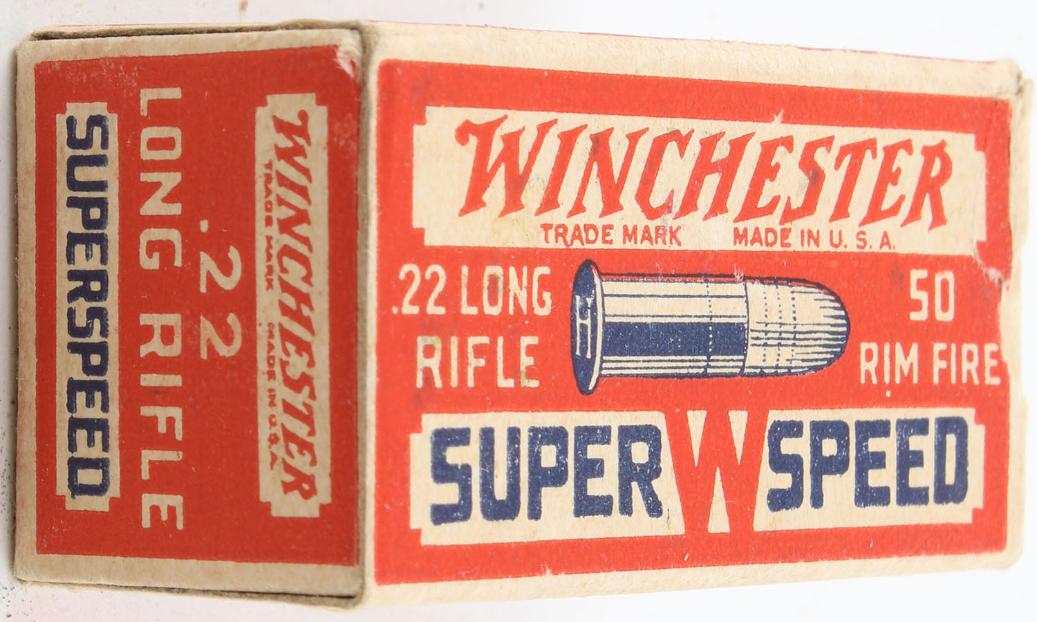 Winchester, Super Speed, .22 Long Rifle, RHWeb: WRA-13 LR-1b, Full, 1pc. Red white & blue box, box is solid with excellent color, very minor age soiling & corner wear, edges are crisp, end flaps are solid, ammo is excellent. Grade: Excellent - Value: 30 to 45