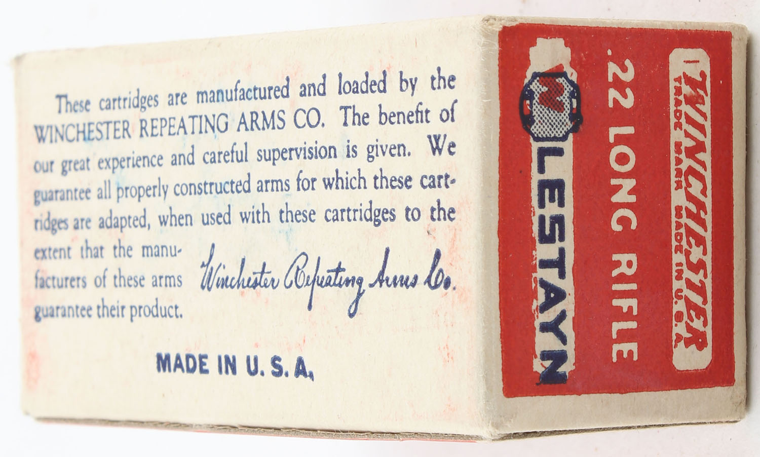 Winchester, Lestayn, .22 Long Rifle, RHWeb: WRA-13.5 LR-1a, Full, 1pc. Red white & blue box, box is MINT with minty color, corners are sharp, edges are crisp, end flaps are solid, ammo is good to very good. Grade: MINT - Value: 150 to 225