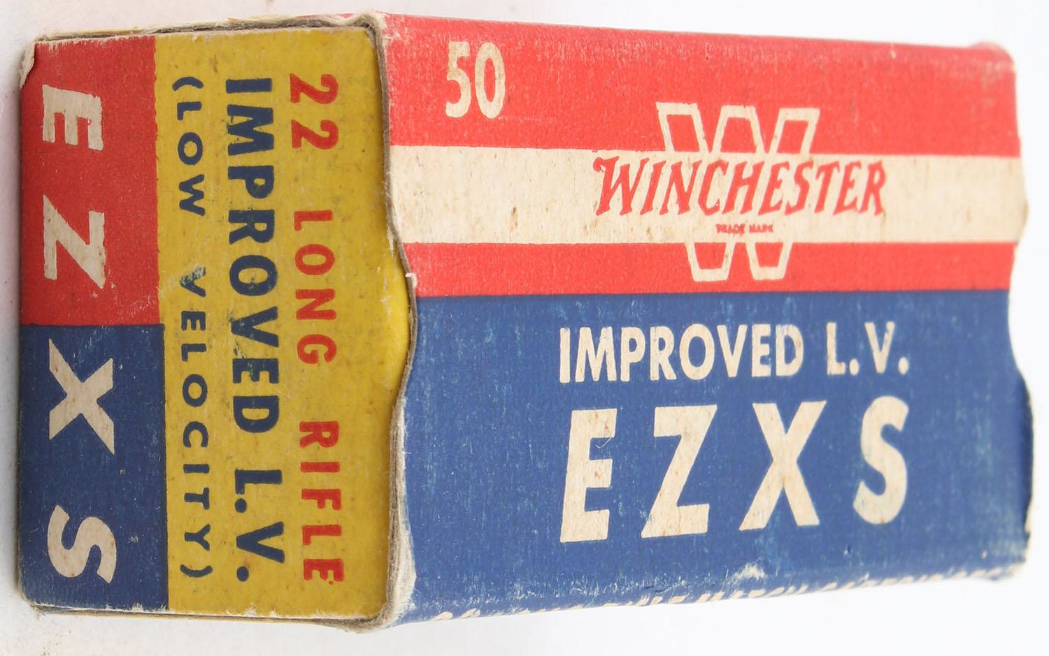 Winchester, Improved L.V. EZXS, .22 Long Rifle, RHWeb: WRA-54 LR-8b, Full, 1pc. Blue yellow & red box, box is solid with excellent color, very minor age soiling, minor corner wear, edges are mostly crisp, end flaps are solid, ammo is excellent. Grade: Excellent - Value: 40 to 60