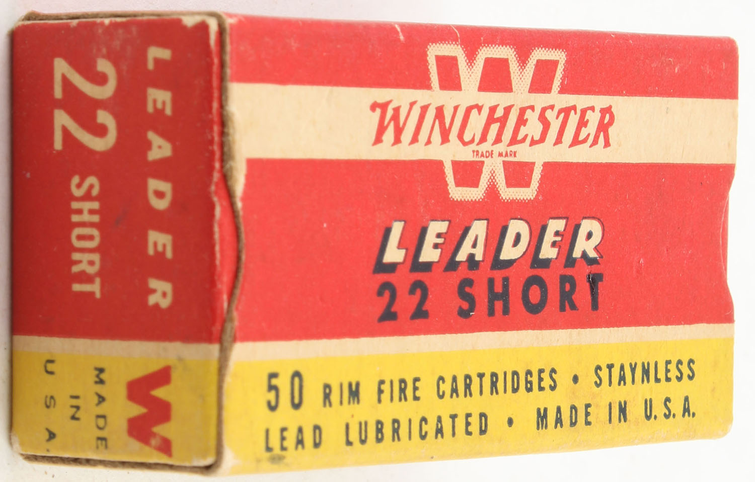 Winchester, Leader, .22 Short, RHWeb: WRA-55 S-2b, Full, 1pc. Red yellow & white box, box is solid with excellent color, very minor age soiling & corner wear, edges are mostly crisp, end flaps are solid, ammo is very good. Grade: Excellent - Value: 12 to 18