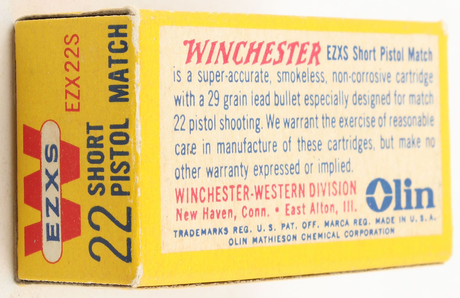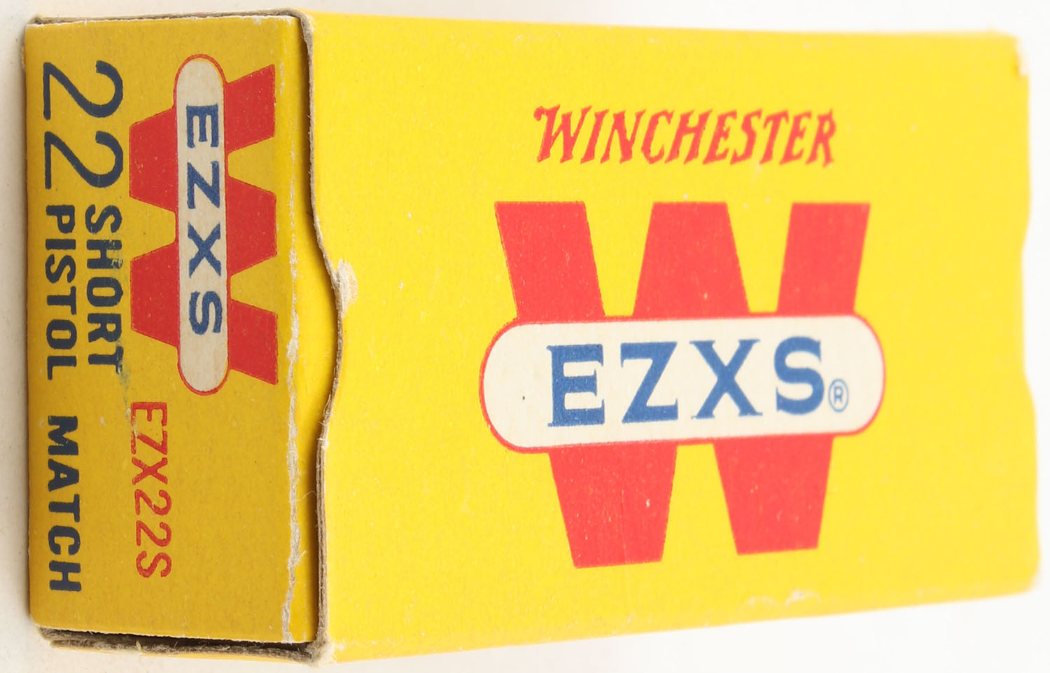 Winchester, EZXS, .22 Short, Pistol Match, RHWeb: WRA-54 S-1, Full, 1pc. Yellow red & white box, box is solid with excellent color, very minor corner wear, edges are crisp, end flaps are solid, ammo is minty. Grade: Excellent + - Value: 30 to 45