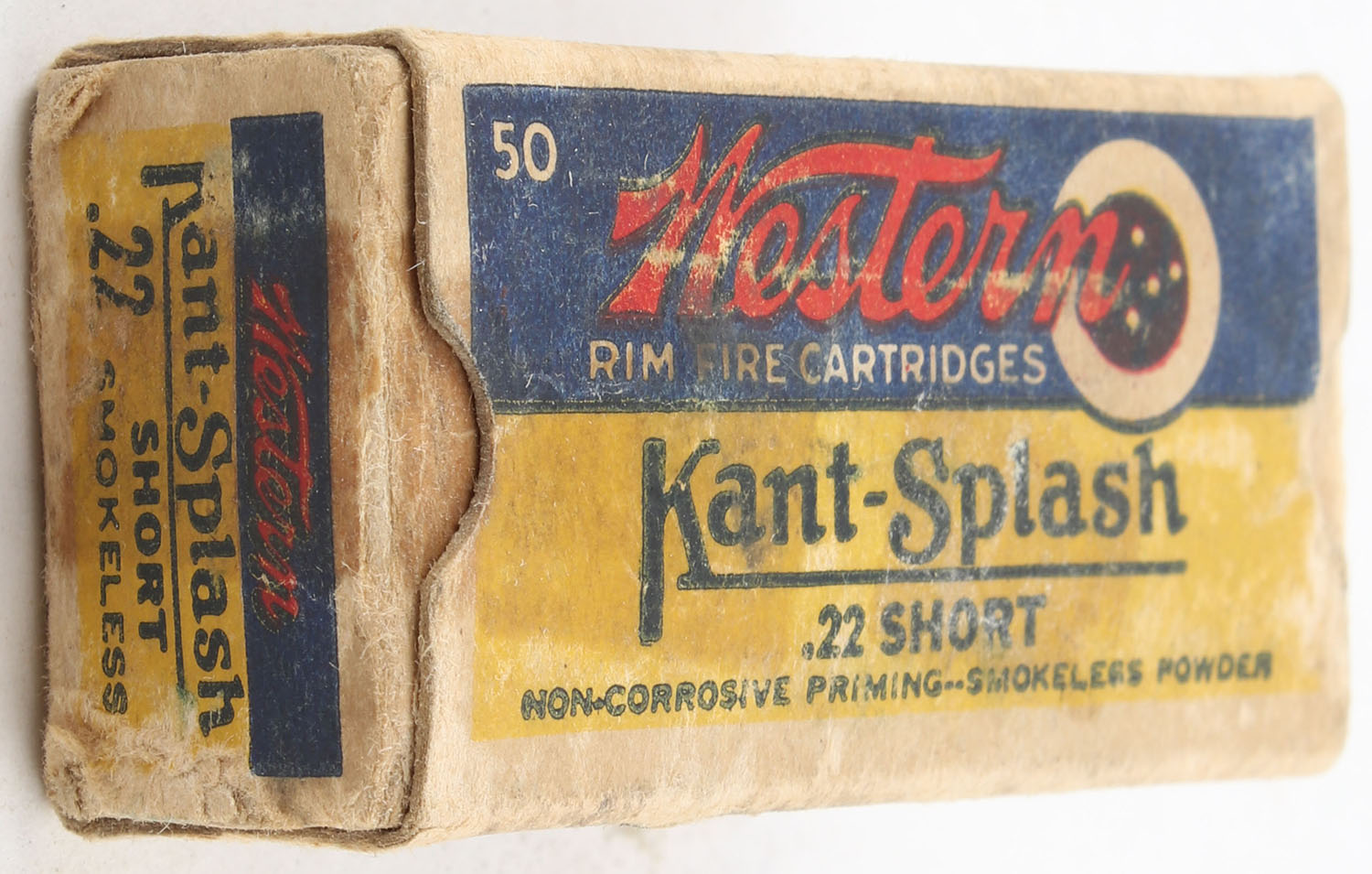 Western, Kant-Splash, .22 Short, Smokeless, RHWeb: WCC-49 S-1d, Partial 28rds. 1pc. Yellow blue & red bulls eye box, box is solid with good color, age soiling, some shelf wear, some edge & corner wear, end flaps are solid, ammo is very good. Grade: Good ++ - Value: 40 to 60
