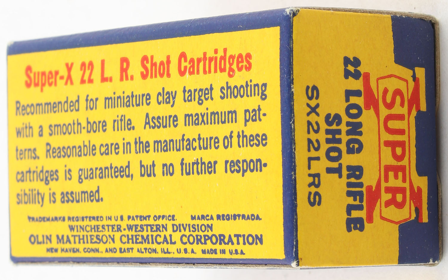 Western, Super-X, .22 Long Rifle Shot, RHWeb: WCC-Super-X-Long Rifle LRS-21, Full, 1pc. Yellow blue & red box, box is MINT with minty color, corners are sharp, edges are crisp, end flaps are solid, ammo is excellent. Grade: MINT - Value: 24 to 36