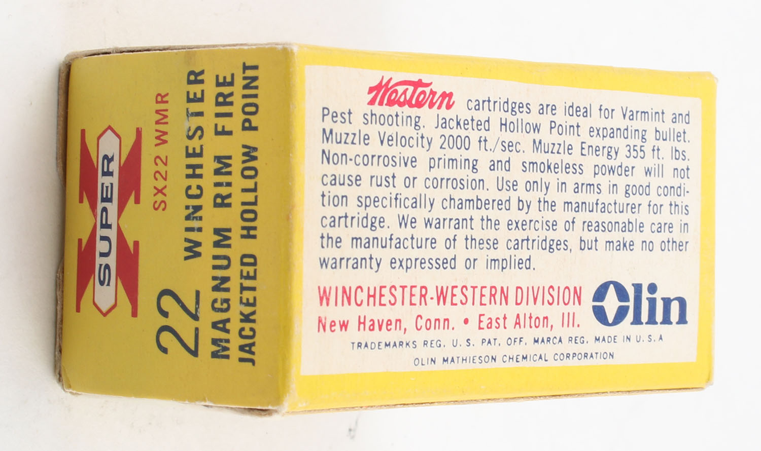 Western, Super-X, .22 Winchester Magnum, 40 Grain Jacketed Hollow Point, RHWeb: WCC-12 WMR-1a, Full, 1pc. Yellow red & white box, box is solid with minty color, minor corner wear, edges are crisp, end flaps are solid, ammo is excellent. Grade: Excellent + - Value: 10 to 15
