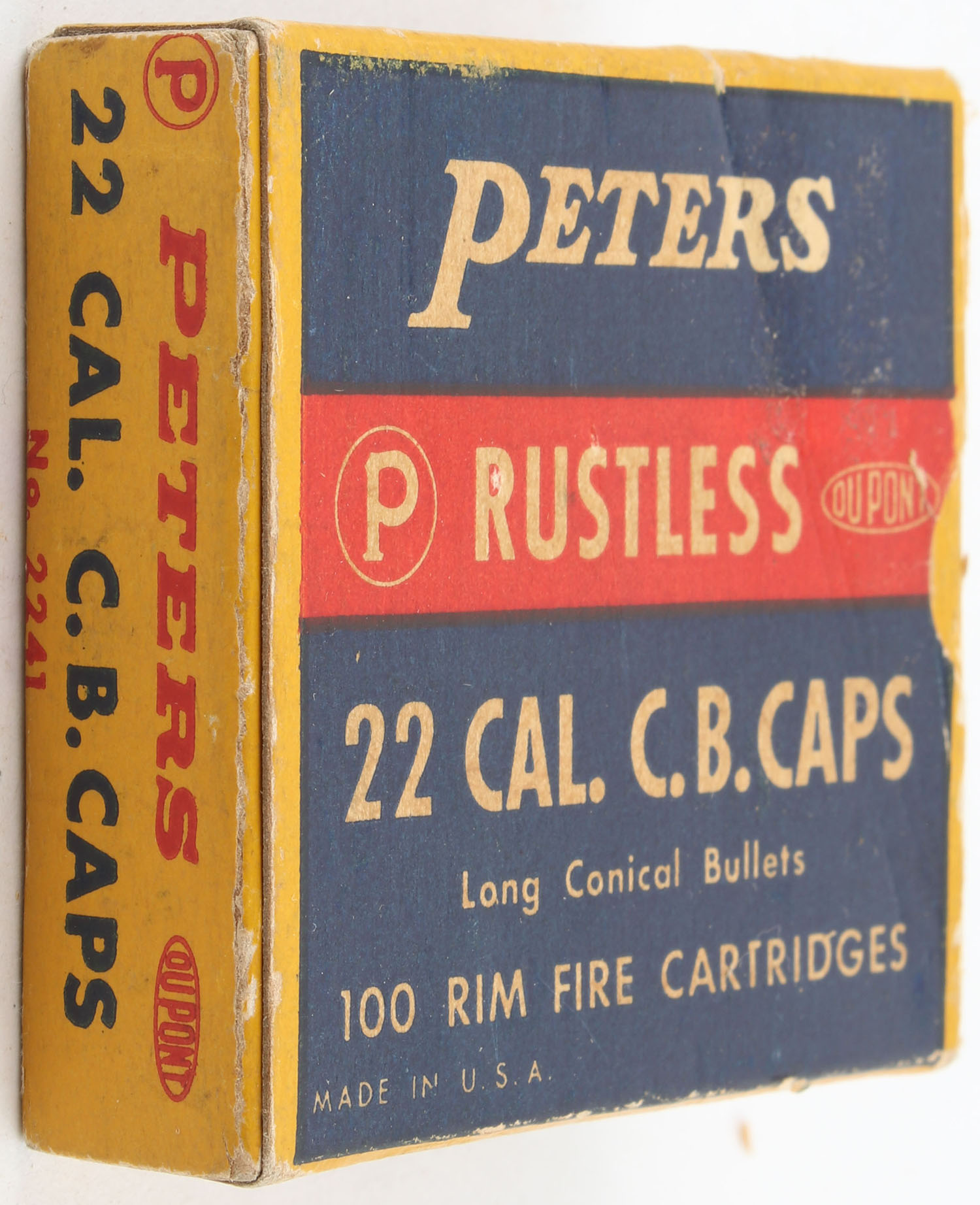 Peters, Rustless, .22 C.B. Caps, RHWeb: PCC-8D CB-1b, Partial approx 75rds. 1pc. Blue yellow & red box, box is solid with very good color, some age soiling, minor edge & corner wear, end flaps are solid, ammo is excellent. Grade: Very Good + - Value: 24 to 36