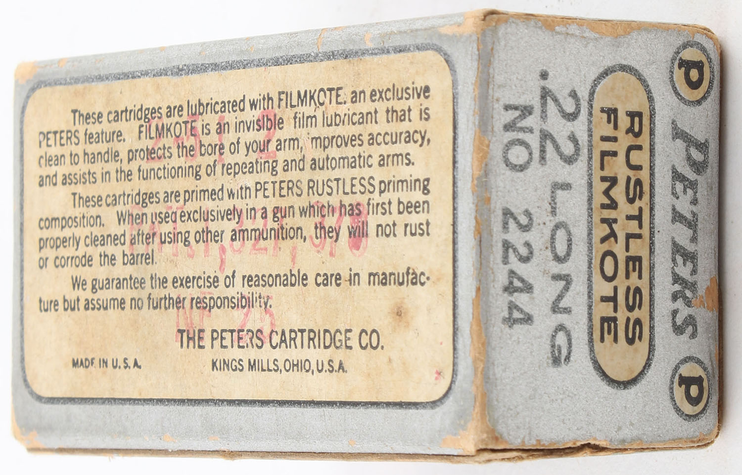 Peters, Rustless Filmkote, .22 Long RHWeb: PCC-12 L-1c, Full, 1pc. Black & silver box, box is solid with good to very good color, minor age soiling & shelf wear, some scuffing, some edge & corner wear, end flaps are solid, ammo is excellent. Grade: Very Good - Value: 40 to 60