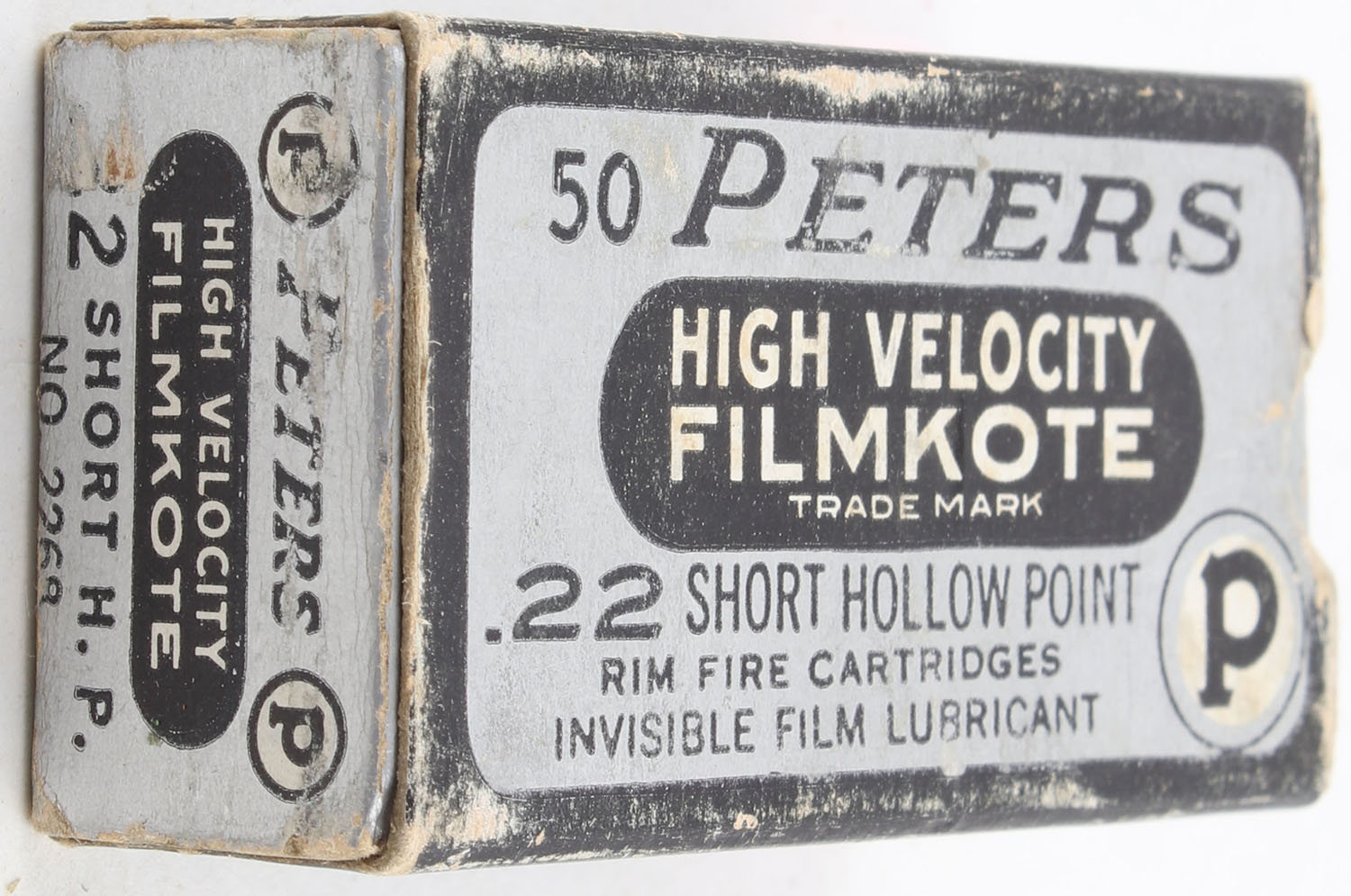 Peters, High Velocity Filmkote, .22 Short Hollow Point, RHWeb: PCC-13 S-3g, Partial 34rds. 1pc. Silver & black box, box is solid with very good color, some shelf wear, some edge & corner wear, end flaps are solid, ammo is excellent. Grade: Very Good - Value: 10 to 15