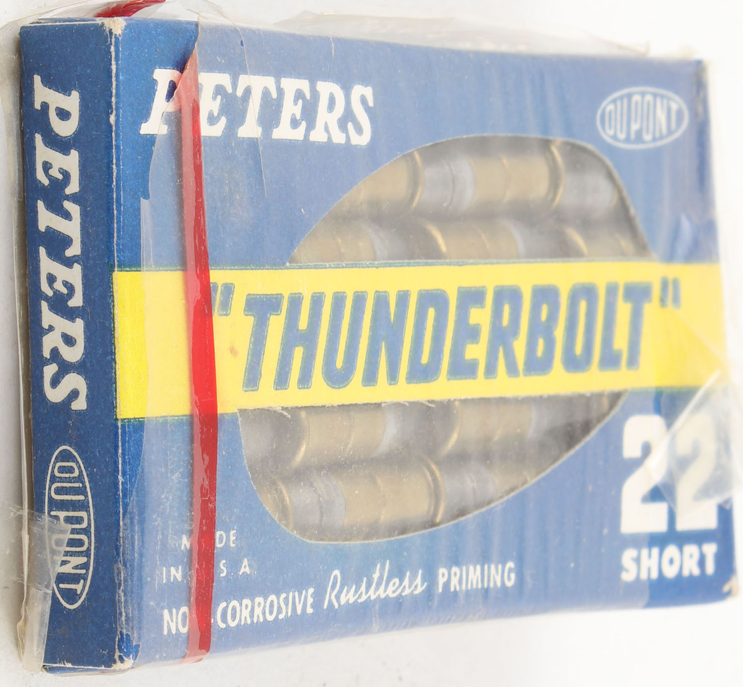 Peters, ''Thunderbolt'', .22 Short, RHWeb: PCC-17 S-5, Full, 1pc. Blue yellow & white flat pack, pack is solid with minty color, minor corner wear, edges are crisp, end flaps are solid, cellophane wrap is 90% intact, ammo appears minty. Grade: Excellent - Value: 40 to 60