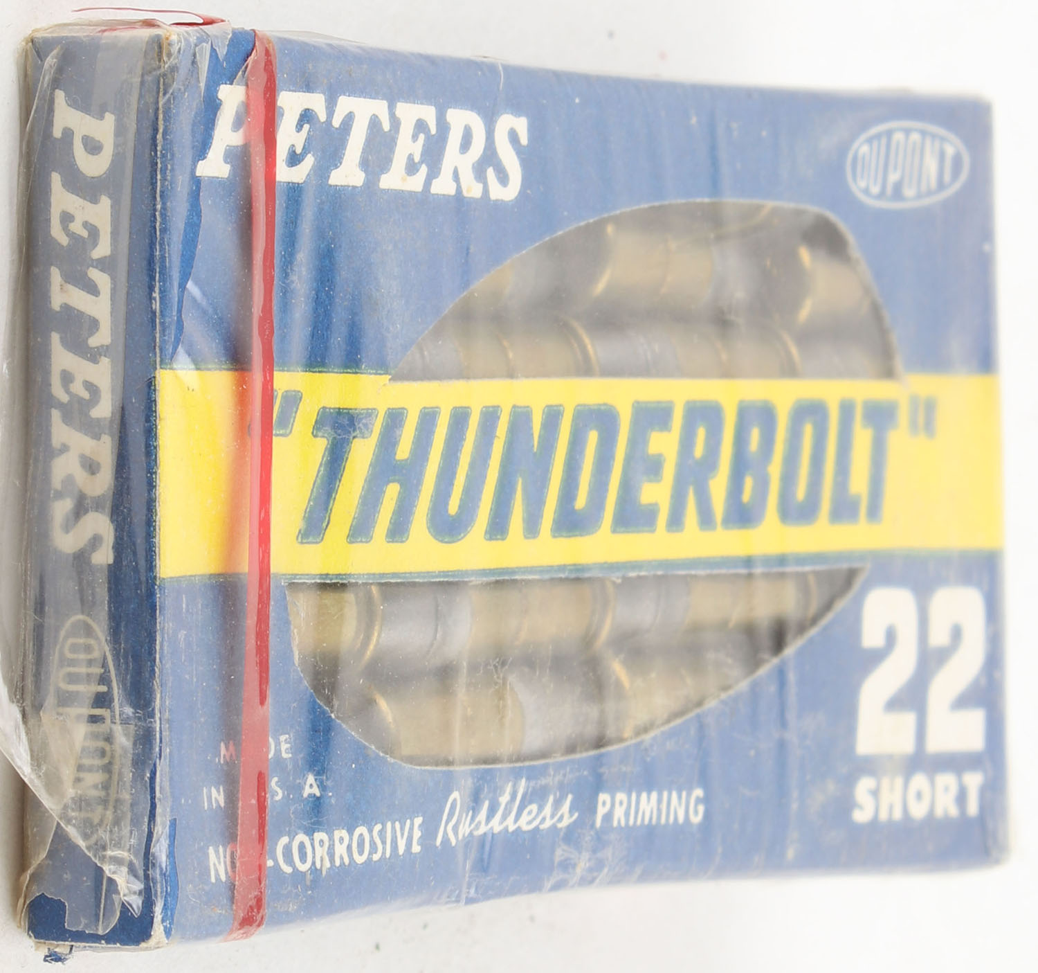 Peters, ''Thunderbolt'', .22 Short, RHWeb: PCC-17 S-5, FULL & SEALED, 1pc. Blue yellow & white flat pack, pack is solid with minty color, corners are sharp, edges are crisp, ammo appears very good. Grade: Excellent ++ - Value: 60 to 90