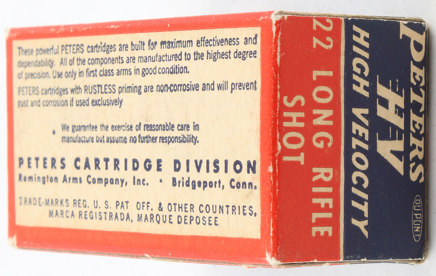 Peters, High Velocity, .22 Long Rifle Shot, RHWeb: PCC-17A LR-5, Full, 1pc. Blue red & white box, box is solid with excellent color, very minor corner wear, edges are crisp, end flaps are solid, ammo is minty. Grade: Excellent + - Value: 12 to 18